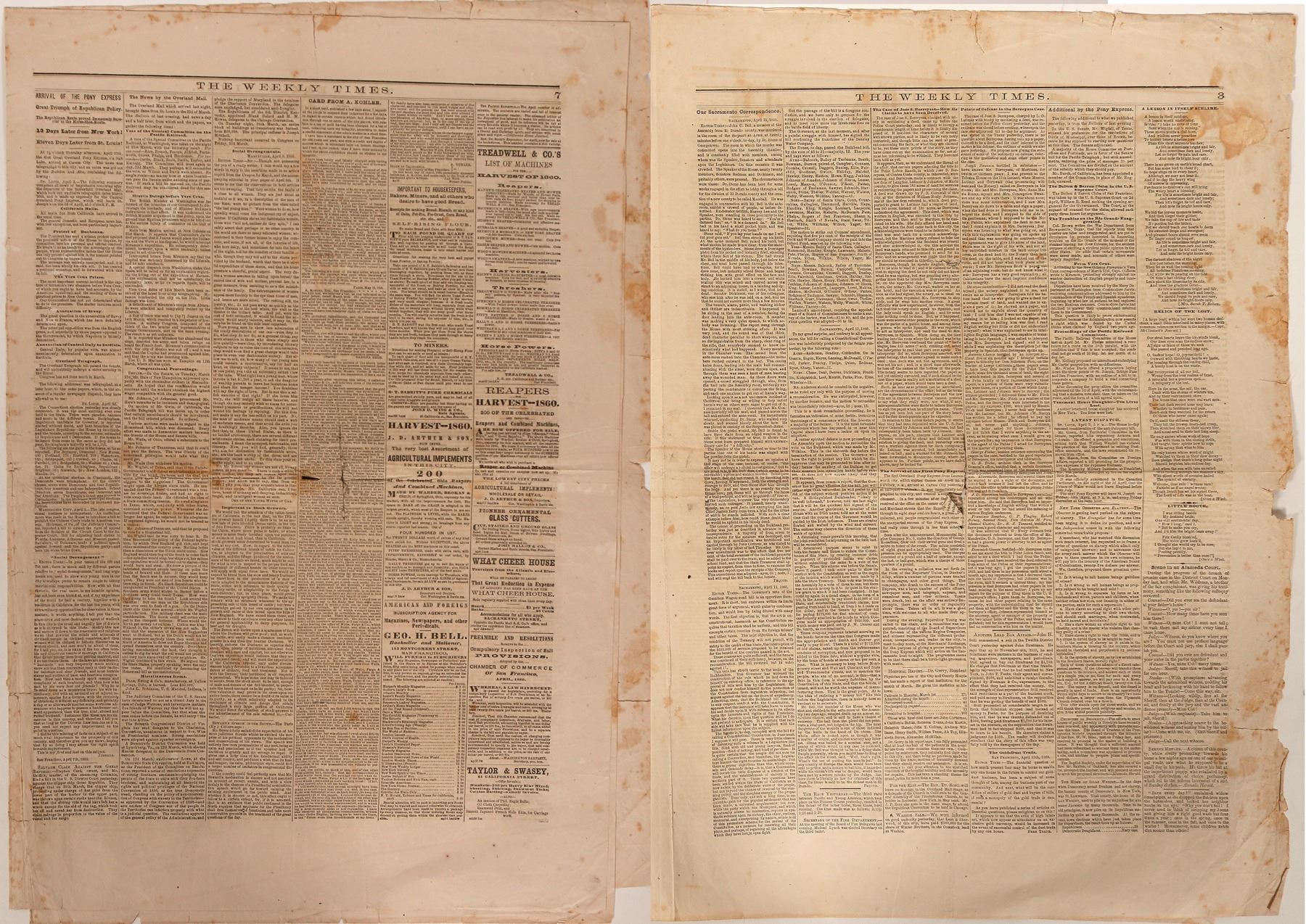 8 pages including an article on arrival of Pony Express. 13 days later from New York, superior to the Horse Shoe Route. Foxing and some tears. Sold as is.