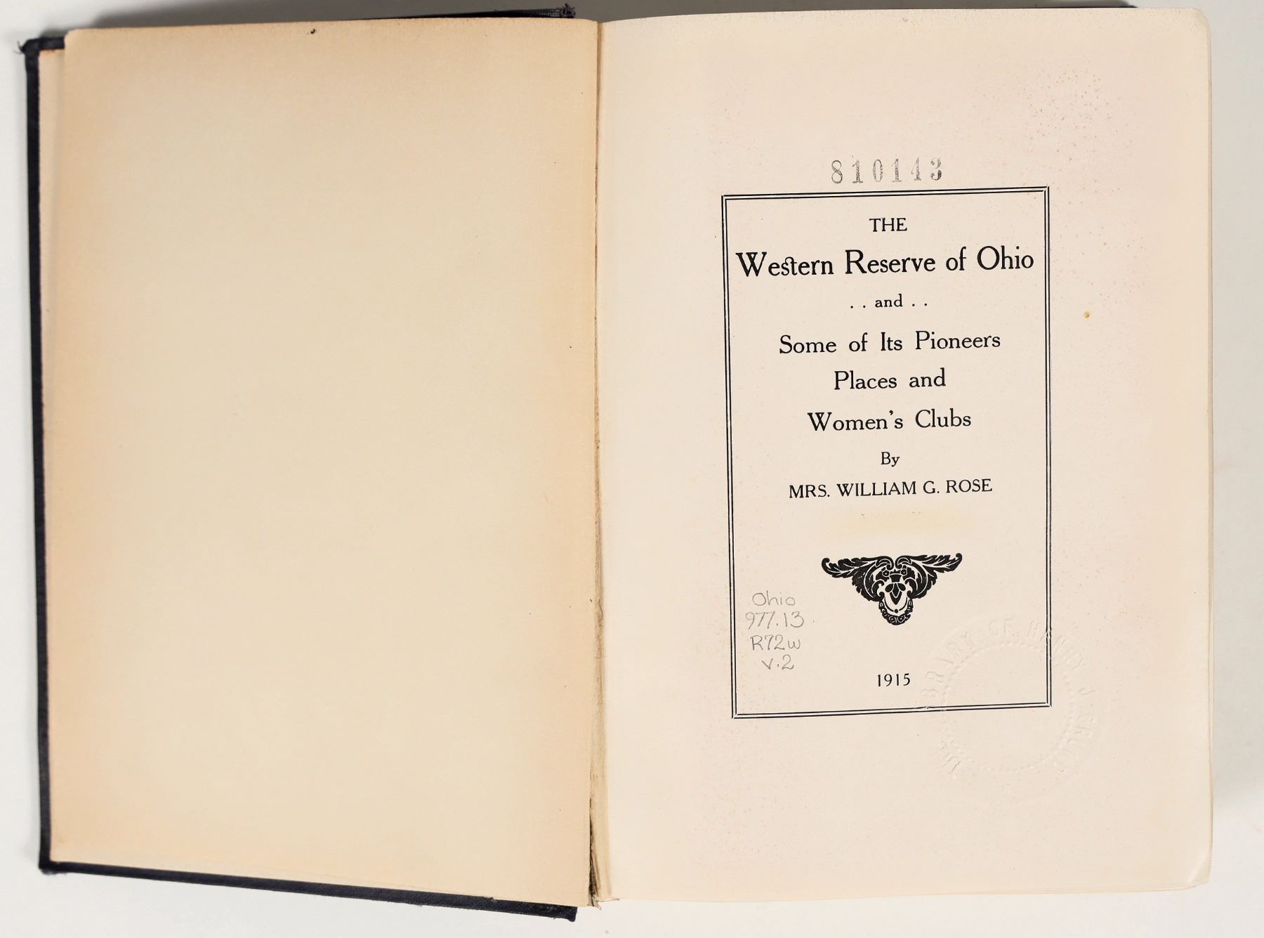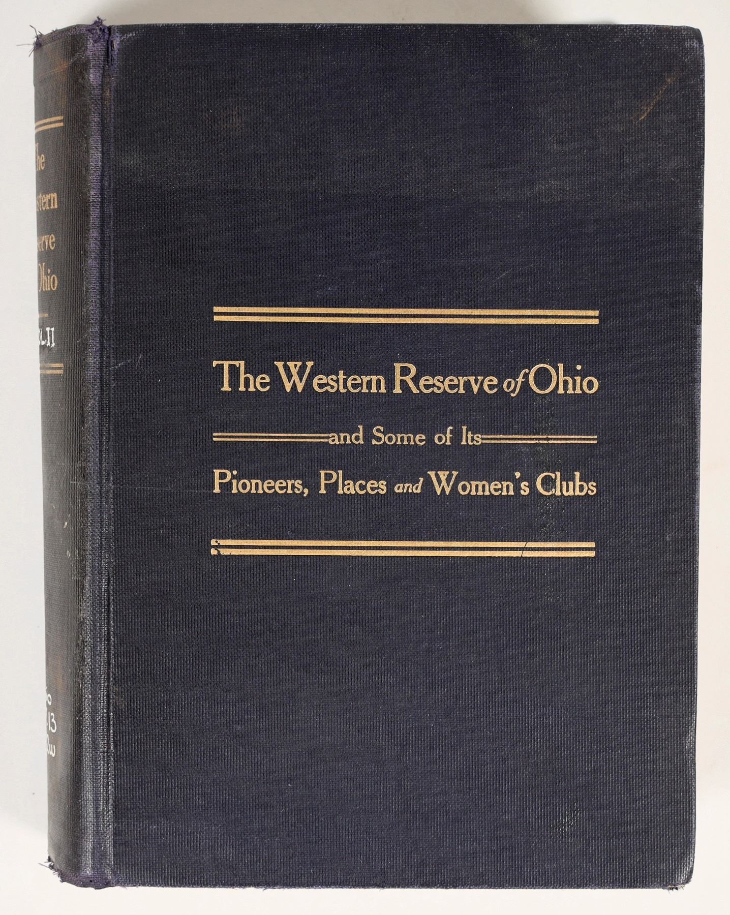 A copy of 'The Western Reserve of Ohio and Some of Its Pioneers, Places, and Women's Clubs' by Mrs. William G. Rose, published 1915 by the Press of Euclid Printing Co. of Cleveland. Illustrated throughout with B&W photos. 564 pages. Detached spine; see photos. 5.5"x7.5"x1.5".