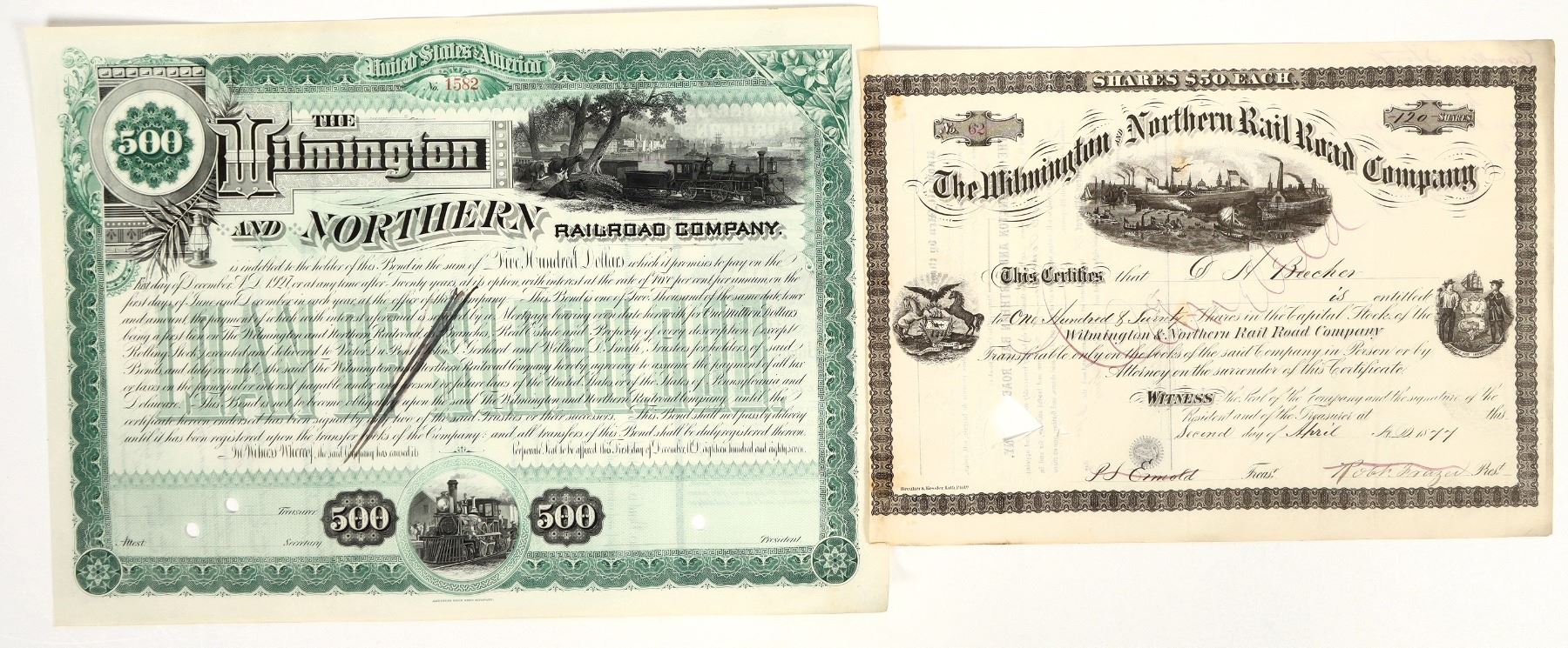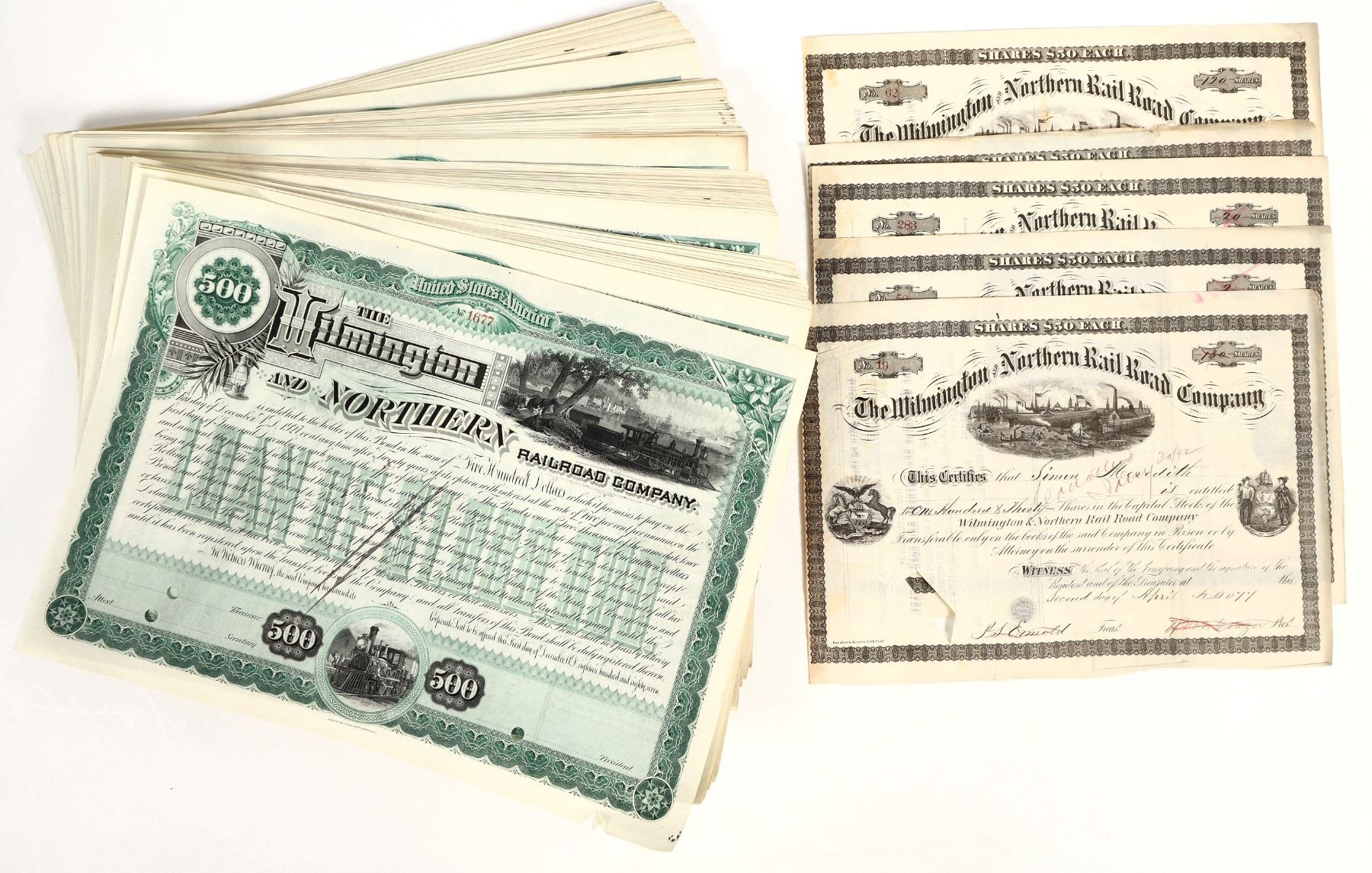 Approx. 175+. I/C, only seven 1877. remainder unissued. Two varieties. The Wilmington and Northern Rail Road Co. VG or better. Brueker & Kessler printer. Mix of stocks and bonds.