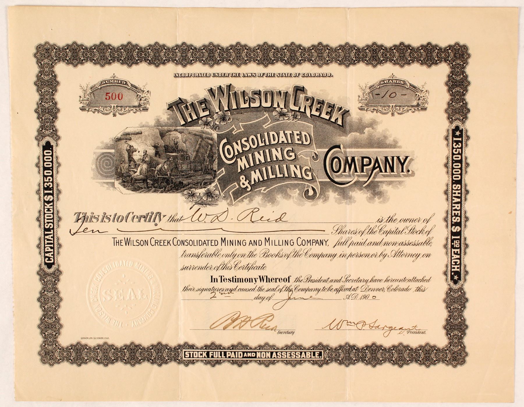 Inc. in Colorado. No. 500, issued for 10 shares to W.D. Reid on June 2nd, 1900. Signed by president William P. Sargent and the secretary RH Reid. Not cancelled. Ornate border and logo. Underground mining vignette. Printed by Denver Lith. Co.Folds. Very fine. 9.25 x 12" According to the Cripple Creek Manual, they owned the Minnie Bell, Little Effie, Little Dessie, Little Giant, and the Little Orphan Boy situated in the SE 1-4 of section 20; also north one-half conflict with Gettysburg and of the Maud Helena No. 2. The company was involved in litigation since July 1899 with the Independence Town and Mining Company. Litigation was still pending at the time of this stock being issued. State: Colorado City: Cripple Creek Al Adams Collection. HWAC# 58426