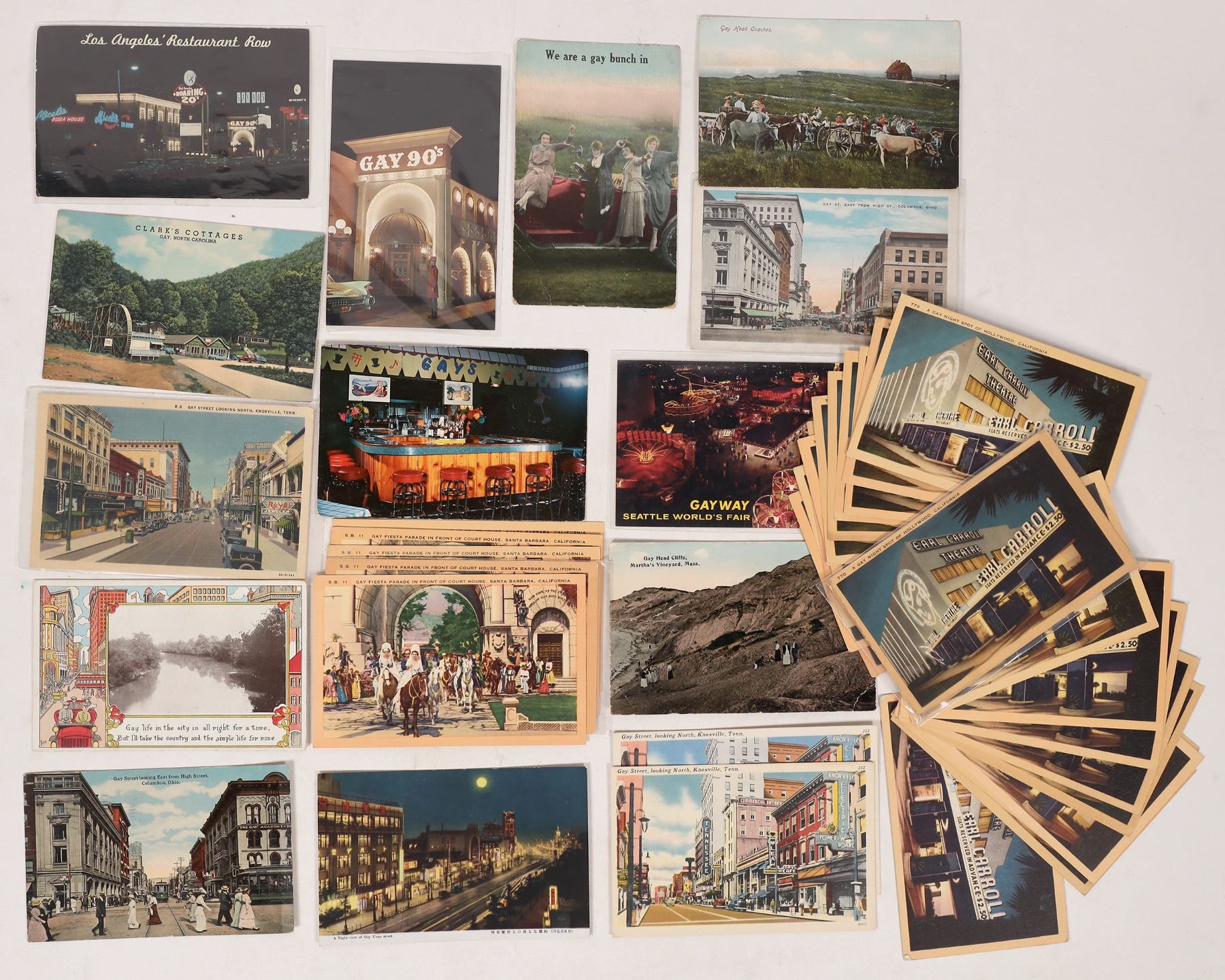 Lot of 45. Mostly linen cards. Postmarks : Oak Ridge Tenn., Columbus Oh., Laguna Beach Ca., Northrop N. Dak., Santa Barbara Ca. Vineyard Haven Ma., Inglewood, Ca., Beverly Hills Ca. One postcard has 1 cent commemorative stamp uncanceled. Views of Earl Carrol Theatre (was also know as Moulin Rouge '50-60's and Aquarius 60's-70's). Gay St. Knoxville Tenn. Gay Fiesta Santa Barbara circa '50s. Gay Head Cliffs Martha Vineyards Mass. Gay's Bar Fairview N.J. Gay North Carolina, Gay '90s club Beverly Hills Ca.,