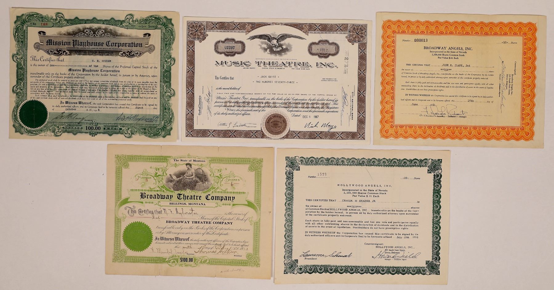 Lot of 5 different. Included: Hollywood Angels, Inc. (NV, 1955); Broadway Angels, Inc. (NV, 1951); Music Theatre Inc. (CA, 1967); Mission Playhouse Corporation (CA, 1926); and Broadway Theatre Company (Billings, Montana, 1913).