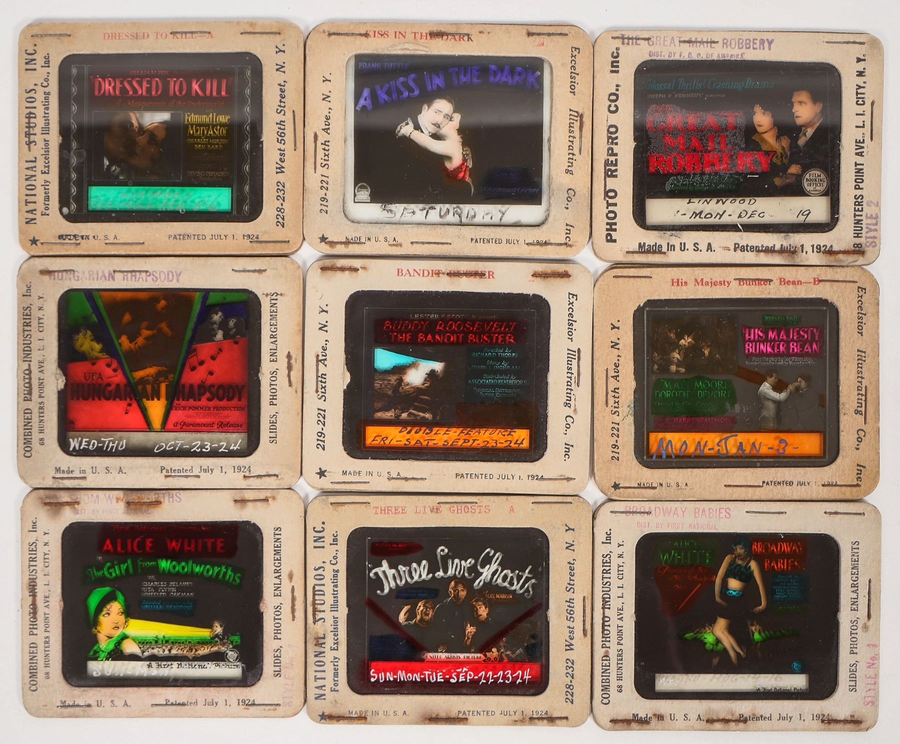 Nine lantern slides from various companies : Combined Photo Ind. National Studios and Photo Repro Co. In good condition and are dated. I.E. movies " Broadway Babies, Great Mail Robbery, Three Live Ghost.