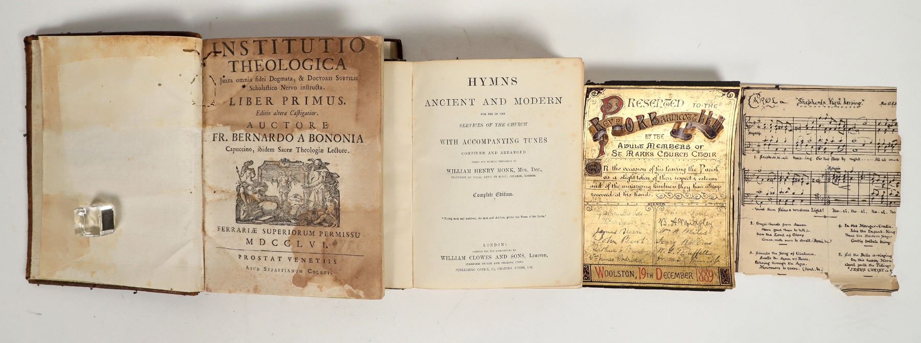 A group of 2 antique theological books. Lot includes one copy of "Institutio theologica juxta omnium fidei dogmata, & doctoris subtilis scholastico nervo instructa"(volume 1) by Bernardo a Bononia, a 1775 theological text written entirely in Latin w/ bookplate from Sutro Library of San Francisco. Also included is an early edition of "Hymns, Ancient & Modern" along with a beautiful hand-illuminated card designating it as a gift to Rev. O.R. Barnicott by the St. Mark's Church Choir in 1899. "Hymns" is in good condition, "Instiutio theologica" has significant foxing and some water damage; see photos.
