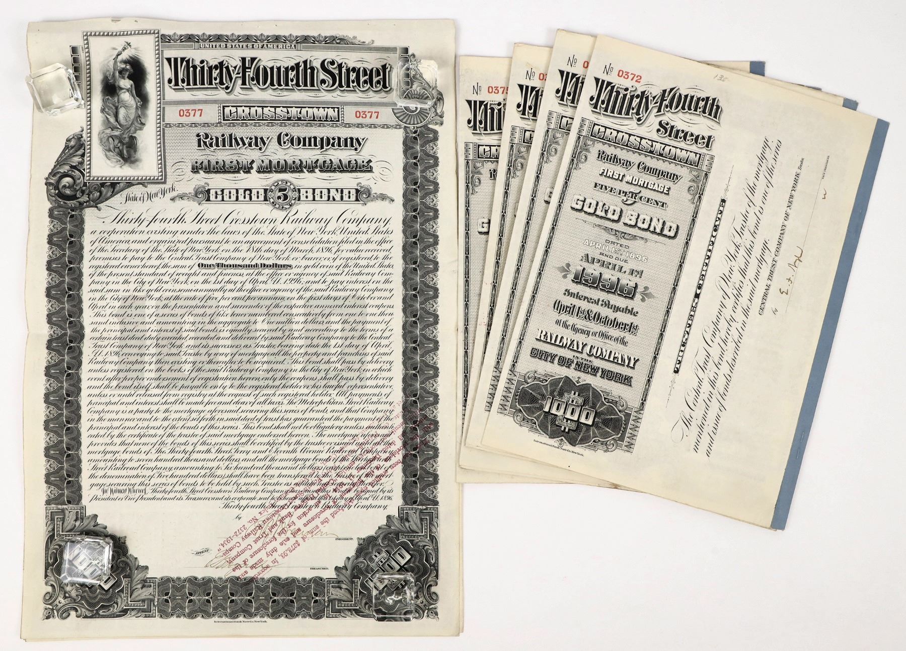 Lot of 5. I/C. Issued 1896. EF cond. Thirty-Fourth Street Crosstown Railway Co., $1000, 5% gold bearer bonds with coupons. International BNC printer.