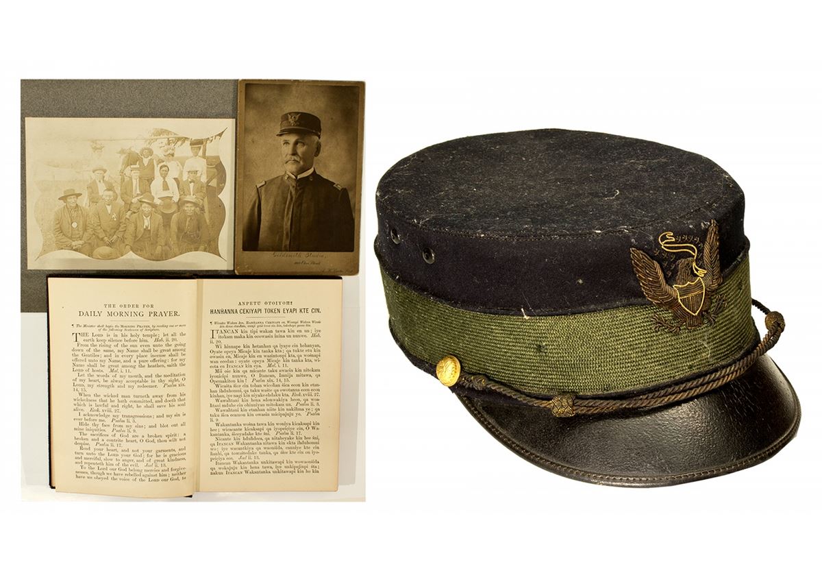 This lot of four artifacts represents an irreplaceable portion of history surrounding the American Indian Wars of the late 19th century. 1) A 4" x 5.5" photograph on 4.5" x 6.5" cardstock mat, showing Captain Thomas Downs wearing his uniform and officer`s dress cap from the Spanish-American War. Downs was born in Lawrenceburg on March 31, 1845. As a young teen he enlisted as a private in Co. K, 54th Indiana Infantry. During the Spanish-American War, Downs was called into action and spent the rest of his life working for the government. In 1903, he resigned from the military to accept a commission as Special Indian Agent. Downs traveled and worked throughout the west from 1903 to 1910, his biggest engagement was in 1907 when he faced a rebellion by Ute Indians at Thunder Butte on the Cheyenne Agency. He died in 1911 [Thomas Downs Papers, 1862-1938, University of Michigan, Rob S. Cox, March 1997. http://quod.lib.umich.edu/c/clementsmss/umich-wcl-M-3122dow?view=text]. The photo is in good condition, and was produced by Goldsmith Studio of 1012 Olive Street. 2) An Officer`s hat, similar to the one in Downs` photo. Marked a size 7 1/8, this hat is fully lined, and the sweatband is brown leather. The hard leather brim features two gold tone buttons with Eagle and star details, holding a twisted cord across the front of the brim. A green canvas hatband is sewn around the diameter of the hat. Blue felt. The front features a 3-dimensional embroidered eagle with a shield, ribbon, and 13 stars. "The M. C. Lilley & Co" made the hat in Columbus, Ohio. The MC Lilley & Co specialized in military and fraternal hats and regalia from about the Civil War through WWI. 3) A 7" x 5" photograph on 8" x 10" grey cardstock mat, showing a group of Native American men seated before Euro-American men and women. Two of the Native men have medals pinned on or hung or around their necks. Indian peace medals served the purpose of symbolic peace between Native and Euro-Americans, usually presented at ceremonies. The U.S. Government produced peace medals from 1789 to 1889. [Lubbers, Klaus. Born for the Shade: Stereotypes of the Native American in United States Literature and the Visual Arts, 1776-1894. Editions Rodopi. 1994]. 4) "English and Dakota Service Book: Being Parts of the Book of Common Prayer set forth for use in the Missionary Jurisdiction of Niobrara" published in 1900 by the Indian Commission of the Board of Missions, Committee of Clergymen appointed by William H. Hare, Missionary Bishop of Niobrara. Verso in English and recto in Dakota. Covers main prayer activities of the Episcopal Church. Inscribed from Mr. Ashley as a Christmas gift to Mrs. Downs, December 24, 1906. 135 pages, excellent condition in its leather hardback covers.