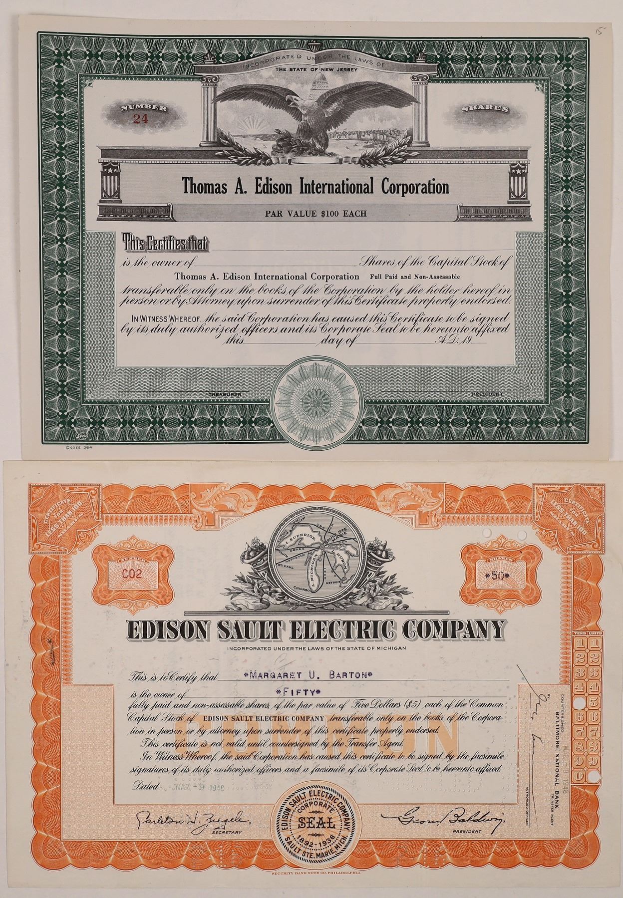 Lot of 2 different. 1) Edison Sault Electric Company. Inc. in Michigan. No. C02, issued for 50 shares in 1949. Printed corp. signatures. Punch cancelled. Orange border, black print, and map vignette of the Great Lakes. This was Michigan public utility company. 2) Thomas A. Edison International Corporation. Unissued. Inc. in New Jersey. Green border, eagle vignette.