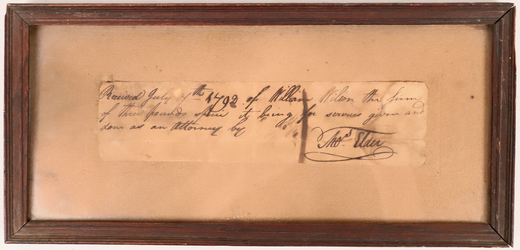Receipt of Thomas Elder, an attorney in Northumberland County to William Wilson for professional services, dated January 17, 1792. "Thomas Elder, the third child of William Elder by his second wife, was born January 4, 1748 in Frederick County, MD, and was married in 1771 to Elizabeth Spalding, a sister of Basil Spalding, of Charles County. Shortly after that event he removed to and occupied a farm in Harbaugh's Valley, where he lived for twenty-eight years, and where his family of eleven children were born." from geni.com. This is possibly the person that signed this document. Document 2x7.75". From the Hyatt Estate. Pennsylvania 1792