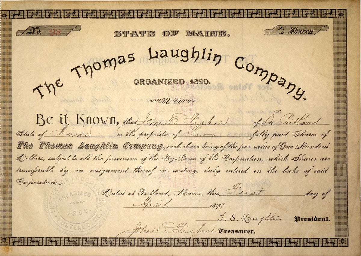 Thomas Laughlin Company stock certificate issued at Portland, Maine in 1899. The company was a manufacturer of marine hardware in iron and brass, and wire rope fittings. Their factory was located in Portland, Maine. Signed by T.S. Laughlin as president. Issued to John E. Fisher for 2 shares. The company was organized in 1890. Some glue residue at left edge where the stub was likely attached. Faint purple text likely cancelling the certificate. VF. City: Portland State: Maine Date: hwac# 25702