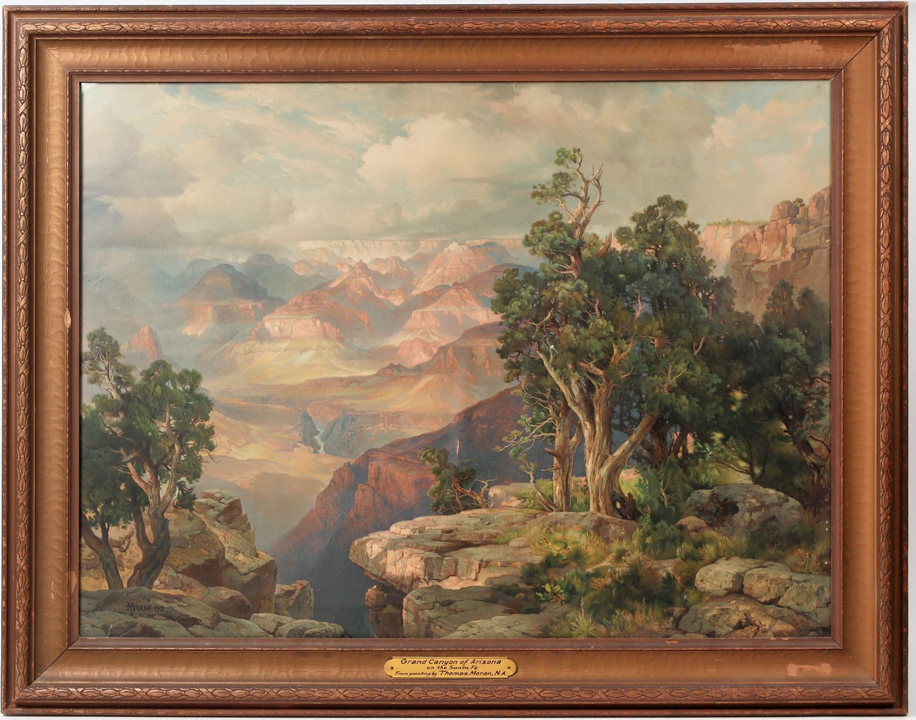 This remarkable chromolithograph, dated 1912, is a promotional piece used by the Atkinson, Topeka and Santa Fe Railway to promote their interests at the Grand Canyon. "The Grand Canyon of Arizona" chromolithograph is in its original frame 41.5 x 33 inches, with an image size of approximately 34.5 x 25.5. The A T & SF RY owned the copyright to the painting from which the chromolithographs were made. The frame contains an original brass tag at bottom center. It is signed by Moran, dated 1912 in the left corner. There are numerous repairs, notably crinkles and small tears along the left bottom and right edges, though from a distance, most of these are invisible. This chromolitho is a rarity, particularly because the number of lithos made for advertising purposes is unknown, and since the railroad holds the copyright, it has never been reproduced.