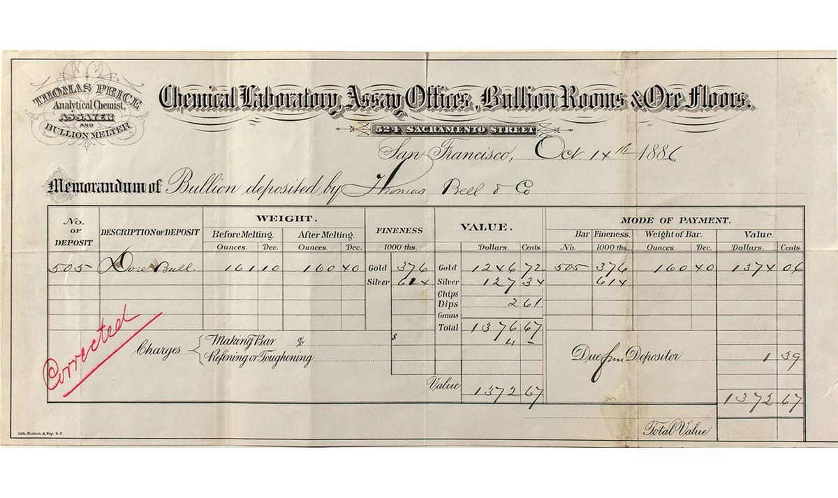 Memorandum of bullion deposited by Thomas Bell & Co. to Thomas Price, Analytical Chemist, Assay and Bullion Melter. Office at 524 Sacramento Street. The sample is 161 ounces with a value of $1,372.67. Printed by Britton & Rey. The handwritten word "Corrected" is written in red ink across the bottom left corner. 1/4" tear at fold on right.