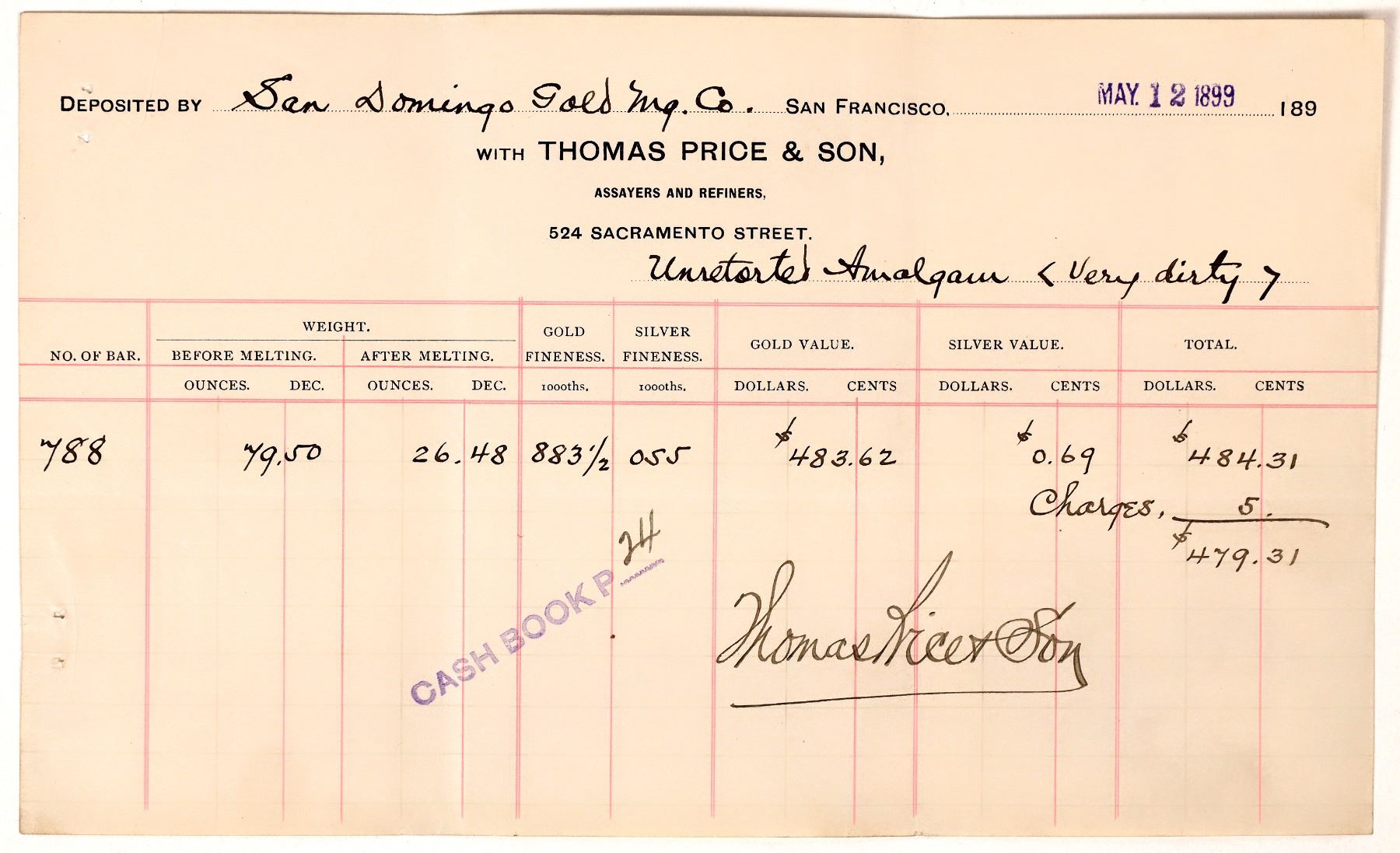 Thomas Price & Son, Assayers & Refiners, San Francisco, CA, 12-May 1899 - No. 788 Deposit of ìUnretorted Amalgam, Very Dirtyî Made out to San Domingo Mining Company. The gold for this assay sheet came from the San Domingo Mine on San Domingo Creek in Calaveras County. It was a successful placer mine for which stock certificates are known. Very Fine. Size: 9.125 x 5.5 inches. San Francisco California Franklin Collection
