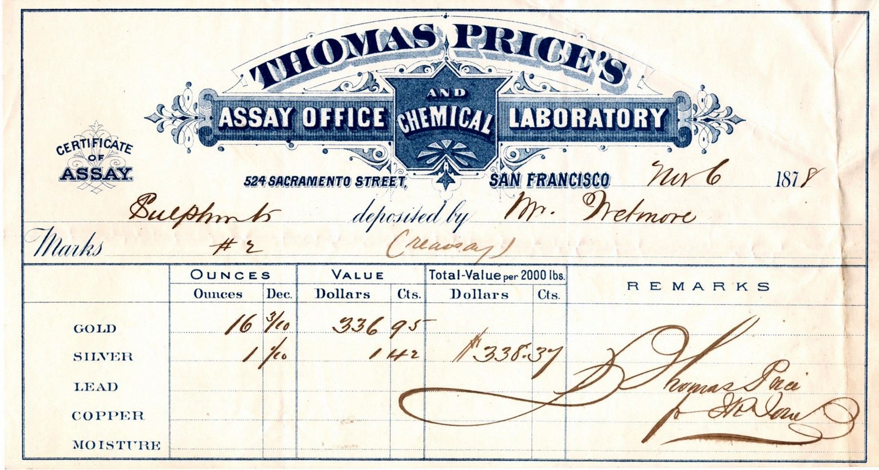Thomas Priceís Assay Office and Chemical Laboratory, San Francisco, CA, November 6, 1878. Certificate of Assay of sulphurets deposited by Mr. Welmore at the San Francisco Office. Certificate is for a re-assay: 16-3/10 oz of Gold and 1-1/10 oz of Silver. Total $338.37. Receipt is blue printed on white paper 9.5 x 5î Signed by Thomas Price. Office was located at 524 Sacramento St. This is a completely different form from a year ago which is the familiar red printed form. Very rare. Very Fine. Size: 9.5 x 5.125 inches. San Francisco California Franklin Collection