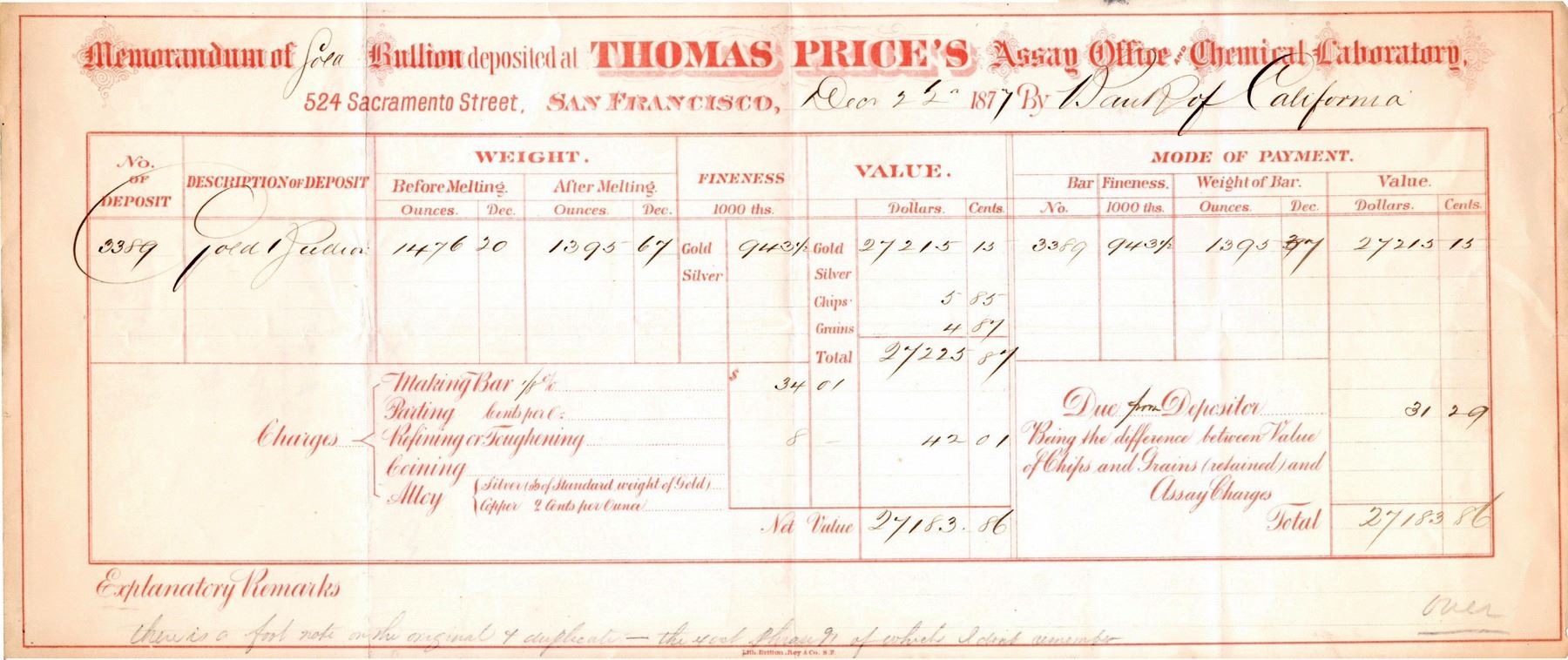 Thomas PriceÌs Assay Office and Chemical Laboratory, San Francisco, CA, December 22, 1877 - Memorandum #3389 of Bullion deposited for Assay of gold bullion by the bank of California at the San Francisco Office on 524 Sacramento St. Before melting 1476.20 oz.; after melting 1395.67 oz. Assayed 943.5 Fine in Gold valued at $27,215.15. Receipt is red printed on white paper 5.5 x 13Ó Credits for the assay chips are added and other charges for refining and making the bar are subtracted yielded a total net of $27,183.57. Calculations also on back. Very rare. Very Fine. Size: 13.5 x 5.625 inches. San Francisco California 1877