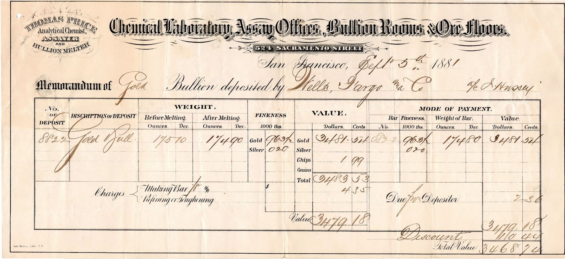 Thomas Price Analytical Chemist, Assayer and Bullion Melter Ò Chemical Laboratory, Assay Offices, Bullion Rooms & Ore Floors Ò Dated Sept. 5th, 1881, Assay Receipt #8822 for a Gold bar deposited by Wells, Fargo & Co. c/o J. Hussey, weighing 174.9 oz. after melting worth $3481.54. Size: 13.25 x 6 inches. San Francisco California 1881