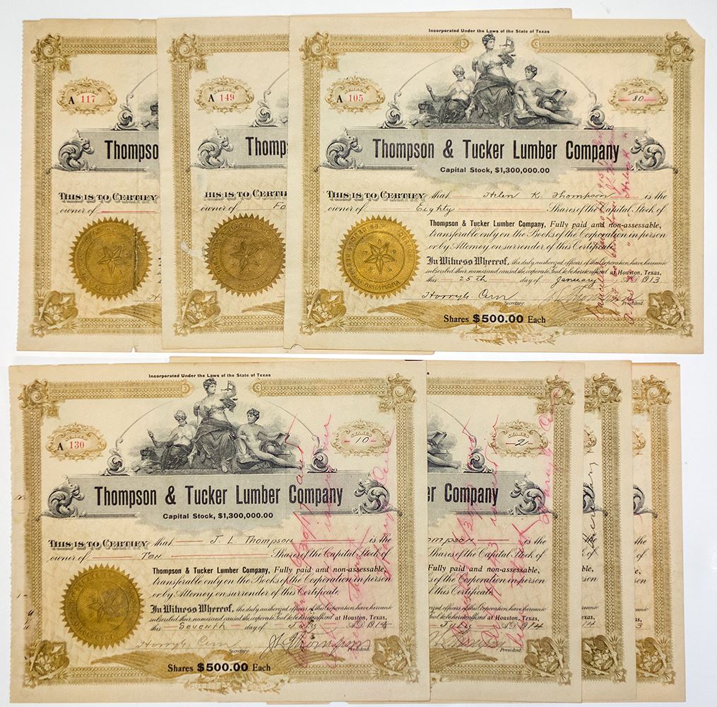 Seven issued certificates from the Thompson & Tucker Lumber Company. Issued between 1913 and 1917 at Houston, Texas. Allegorical females vignette. Some fold splits and bold pen cancels. Some of the red pen cancels are slightly smeared. Condition good to very good.