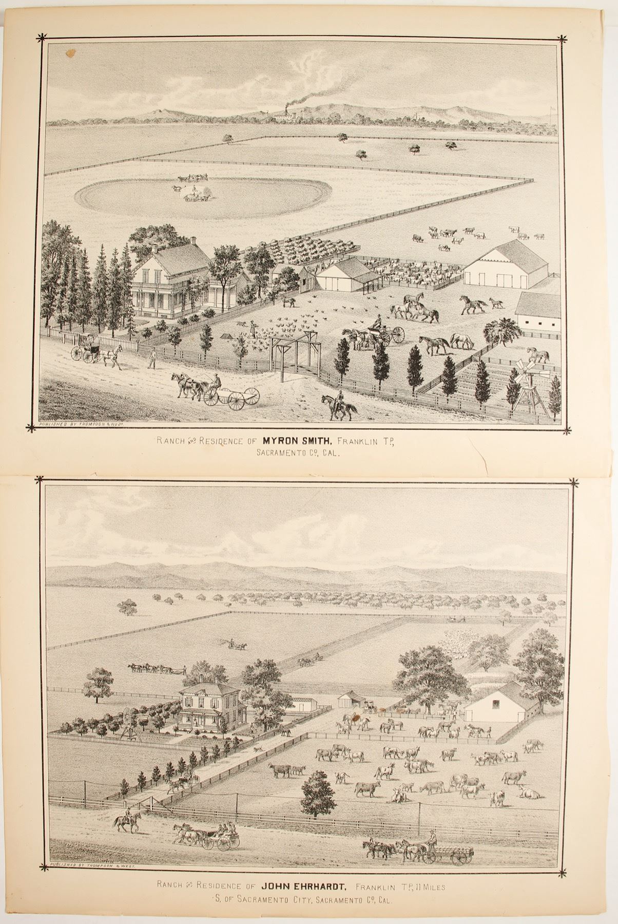 Four lithographs on two-sided 14 x 11 inch sheets. Ranch and residences of John Ehrhardt; Rev. I. E. Ross; Myron Smith; and Charles A. Hull. All in the Franklin Township.