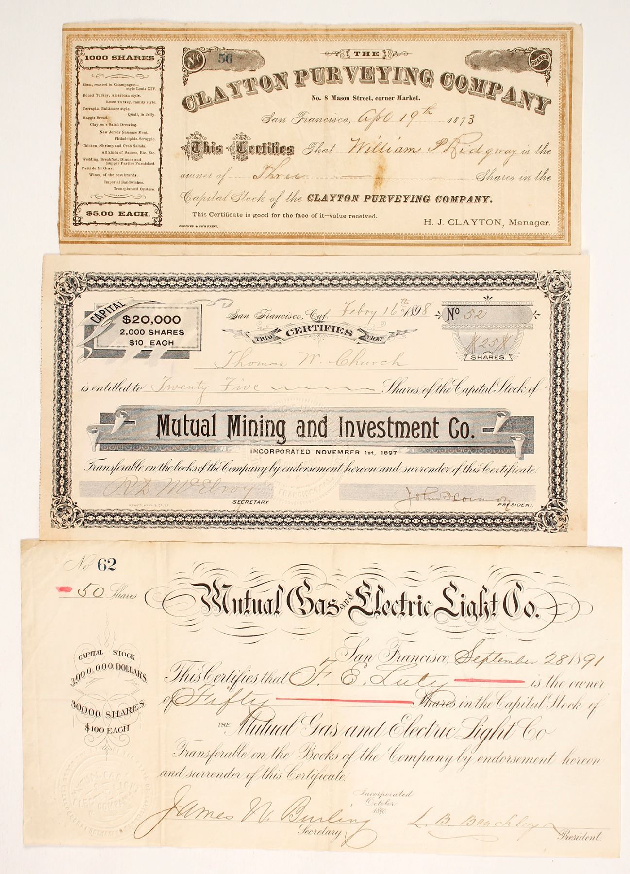 1) Clayton Purveying Company. 1873. Number 56 for three shares. Located at Number 8 Mason Street, corner Market. Ad on left is very interesting and includes 16 items: Ham roasted in Champagne, Philadelphia Scapple, Quail in July, transplanted oysters, crb sales, etc. 2) Mutual Mining and Investment company. 1898. #52 for 25 shares to Thomas W Church. 3) Mutual Gas and Electric Company. 1891. # 62 for 50 shares to FE Lutz. President LB Beachley. Incorporated October 1890. Overall condition of these stocks in very nice. Ken Prag Collection