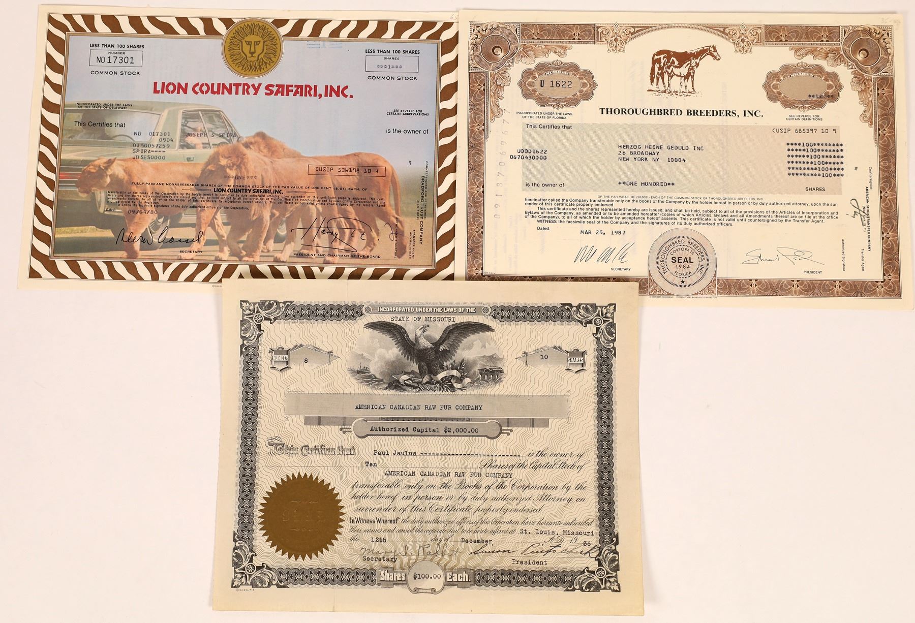 Lot of 3 different. 1) American Canadian Raw Fur Company. Inc. in Missouri. Low no. 6, issued for 10 shares in 1936. Not cancelled. 2) Lion County Safari, Inc. Issued in 1980. Colorful with photo vignette of lions. 3) Thoroughbred Breeders, Inc. Issued in 1987. Vignette of horses.