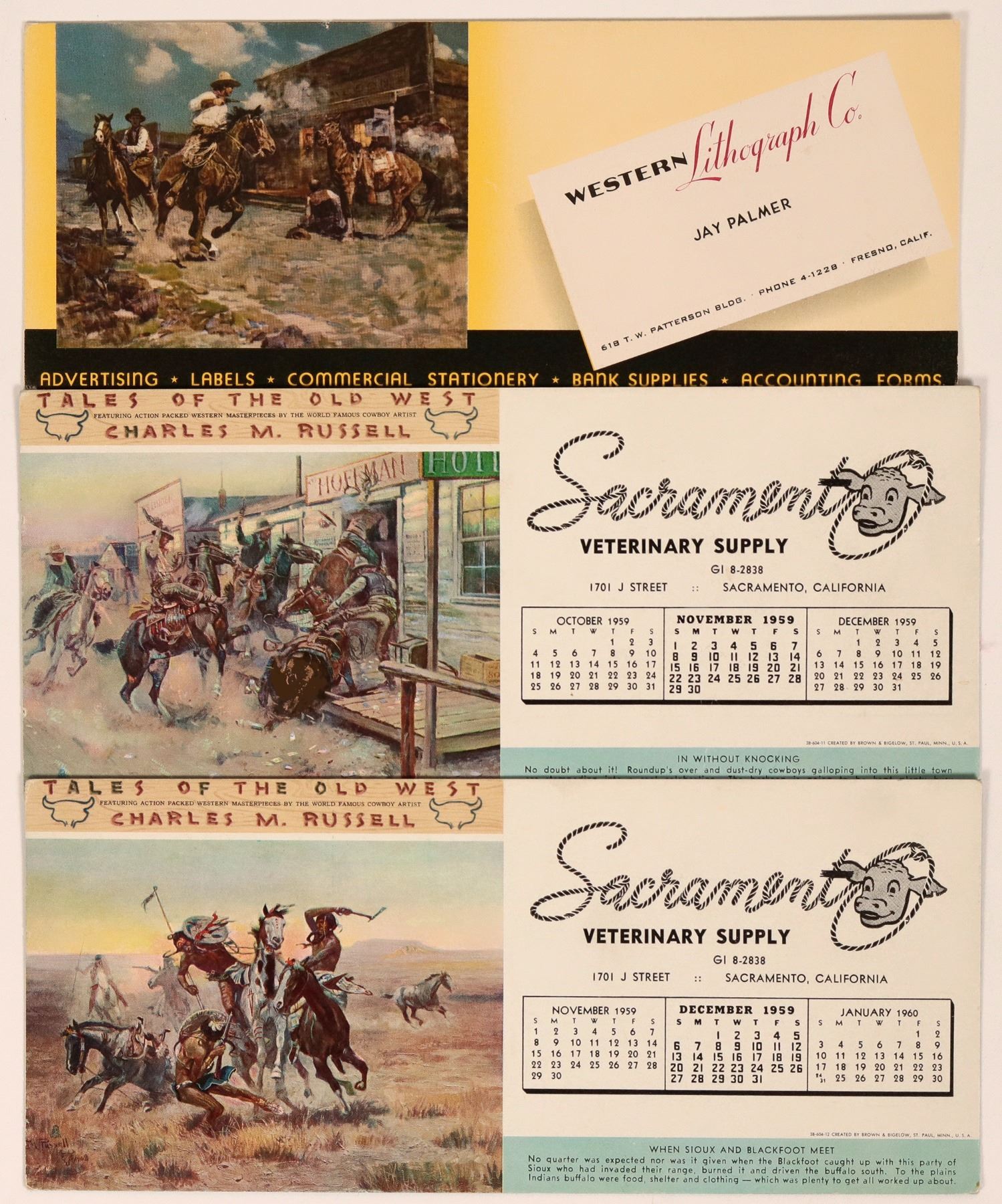 Three art blotters with paintings by famous western cowboy artist Charles M. Russell. Paintings include, "In Without Knocking" and "When Sioux and Blackfoot Meet" from Sacramento Veterinary Supply. The third blotter advertises Western Lithograph Co., Fresno, Cal. It also has what looks like a Russell painting. This is a very nice lot.