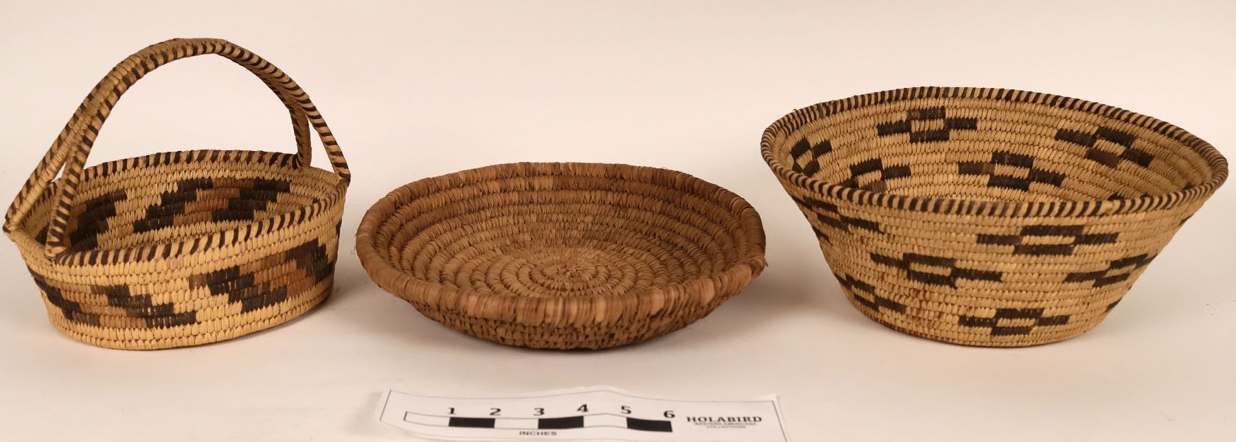 Lot of 3 baskets made to look Native American Indian, but unable to authenticate. 1) 7.5" diameter with handle. 3" high - handle is 7.5" high. Not athentic in style. Possible a tourist piece made in the Papago style. 2) 12" diameter at top, 7" at bottom. 5"high. Very well-made. Possibly authentic Apache, but binding at top edge is suspect. Unauthenticated. 3) 11" diameter at top, shallow tray basket. Roughly made, no design. Appears to be possibly an African piece.