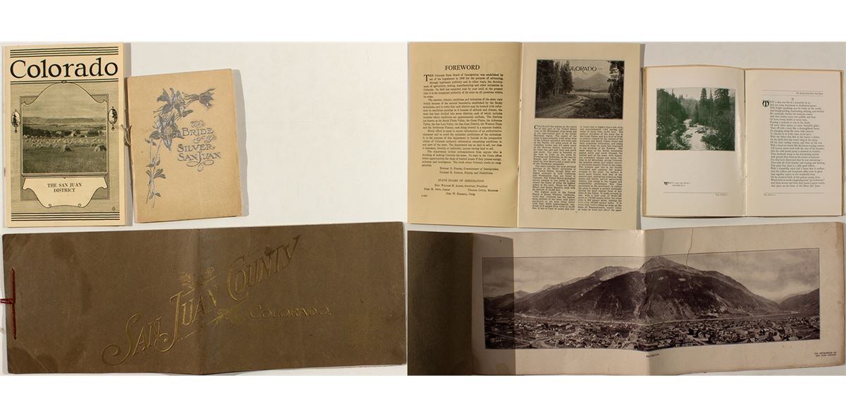 1) "The Bride of the Silver San Juan" 7.25" x 5.25" by Dr. McKendree Demotte. 32 Pages. Poems with 19 pictures. Copyright 1912. 2) "Colorado, The San Juan District" 6" x 9.5" 30 pages. Text with 3 pictures and map. c1930. Information guide for prospective immigrants. 3) "San Juan County, Colorado" Fold-out to 7" x 20." Six pictures of locations in San Juan County.