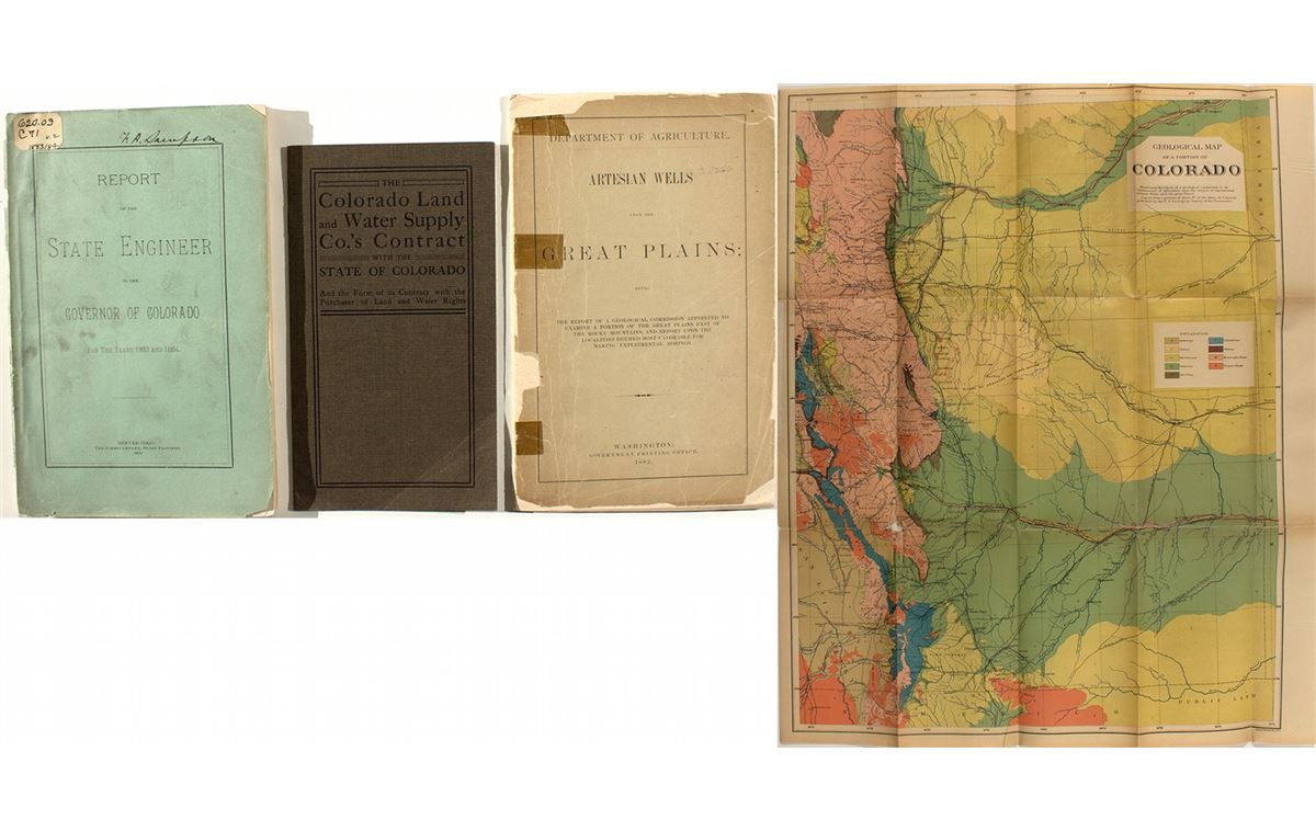 1) Department of Agriculture's "Artesian Wells upon the Great Plains." 1882, Washington D. C. 38 pages. Large very colorful map, 20 x 26". Geological Map of a portion of Colorado. 2) Colorado Land and Water Supply Company. Contract with the state of Colorado pages. 1908. 3) 1884 State Engineer's Report. Includes graphs, charts, list of water districts, reservoirs. Appendix A is a list of all ditches in each water district. I am sure many of these have been lost to history and waiting for someone to bring them back to life. One six-panel fold out showing the Cache La Poudre River. 88 pages plus 100+ pages of charts.