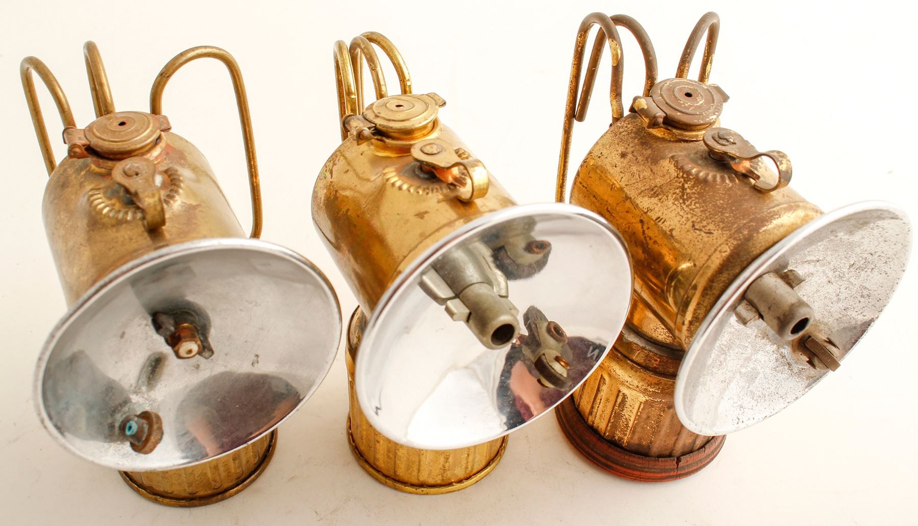 Three brass handheld lamps with nickel reflectors. The attachment of the reflector to the body is similar to the attachment method in 46370. Different than others in the collection. State: City: HWAC#: 46372 Date: