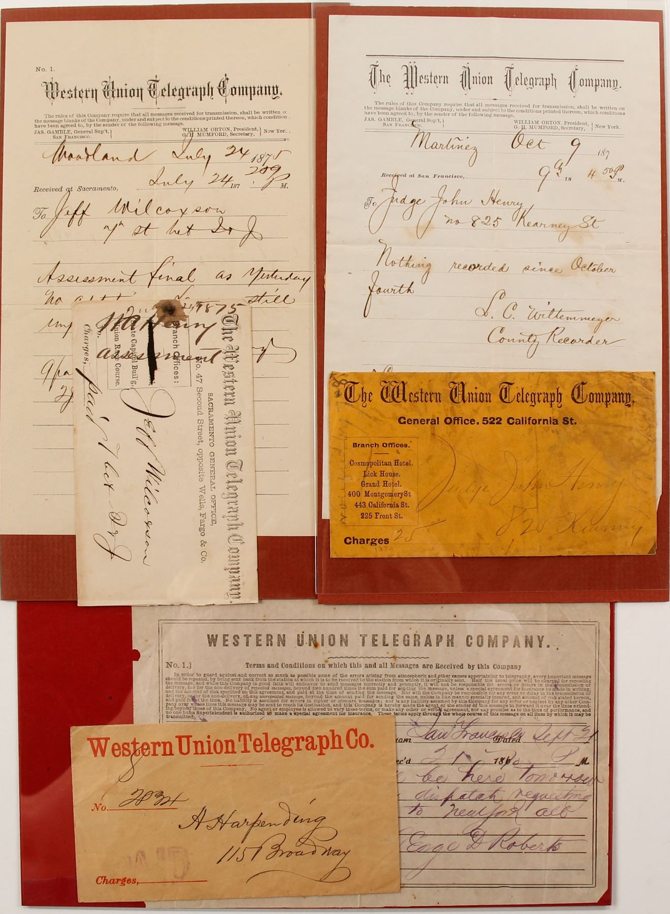 Lot of 3 pairs. 1) 187- , Martinez, CA, to Judge John Henry in San Francisco: Nothing recorded since October fourth." 2) 1875, Woodland, CA to Jeff Wilcox: "Assessment final as yesterday no addition Laura still improving." 3) 1870, San Francisco, to A Harpending in New York: "did you get my dispatch requesting you to go direct to New York." From George Roberts.