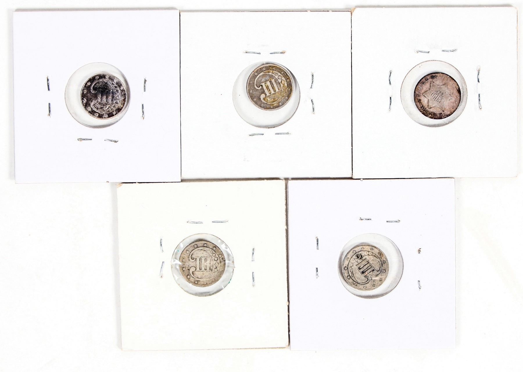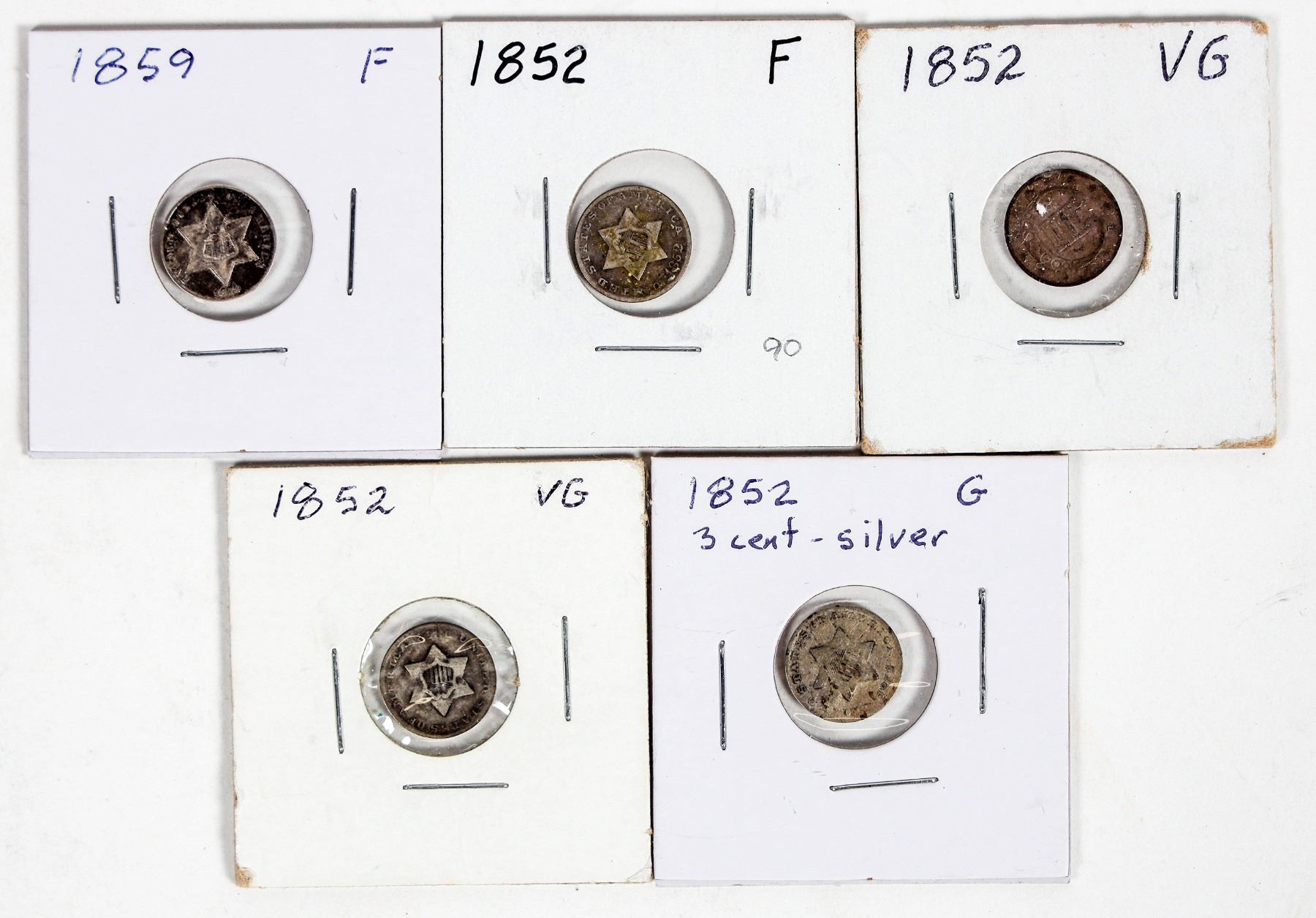 Silver three cent pieces (trimes), the smallest of United States silver coins. Five coins: 1852 (4: G, VG(2); F); 1859 (F).