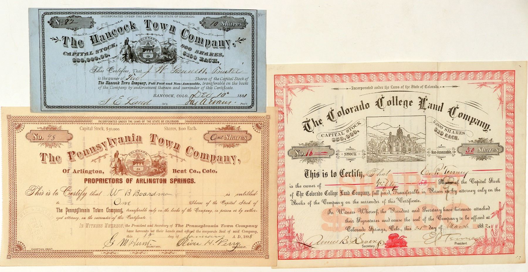 Lot of 3 different. 1) The Hancock Town Company, No. 82, issued for 10 shares to JW Garrett on Dec. 10th, 1881 in Hancock, Colorado. Signed by the president (Evans) and secretary (Land). Not cancelled. Small blue cert. This company plotted the townsite of Hancock and sold lots. Now a ghost town. 2) The Colorado College Land Company. No. 16, issued for 50 shares to the company president EP Torrey on March 21st, 1882 in Colorado Springs. Not cancelled. Vignette of college. Colorado College was founded in 1874 on land designated by U.S. Civil War veteran General William Jackson Palmer, the founder of the Denver and Rio Grande Railroad and of Colorado Springs. The college was founded by Thomas Nelson Haskell. 3) The Pennsylvania Town Company of Arlington, Bent Co., Colorado. Proprietors of Arlington Springs. Issued in 1888. Corp. signatures. Not cancelled. Nice condition. () Ken Prag Collection