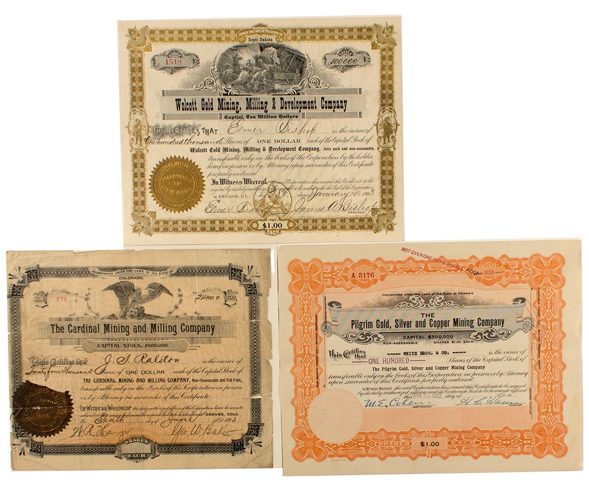 Three issued Colorado mining stocks. 1) Wolcott Gold Mining, Milling & Development Company, cert. #1518, issued at Chicago, Illinois in 1903 to Elmer Bishop the company secretary for 100,000 shares. Signed by James A. Bishop as president and Elmer Bishop as secretary. Operated at Querida, Custer County, Colorado. Owned property on the northwest side of Bassick Hill adjoining the Bassick Mine. A shaft was in place that was near 500 feet deep and was being deepened. U/C. 2) The Cardinal Mining and Milling Company, cert. #171, issued at Denver in 1893 to J.S. Ralston for 24,000 shares. Signed by Geo. W. Baker as president and W.R. Hanze as secy. The company was incorporated in Colorado in 1892 to operate in Boulder County, Colorado. Condition is poor. Many tears and extra folds. U/C. 3) Pilgrim Gold, Silver & Copper Mining Company, cert. #A3176, issued in 1922 to White Bros. & Co. for 100 shares. Incorporated in Delaware. The company held the two forty group, in the Russell district near Central City, Gilpin County. U/C.City: County: State: CODate: