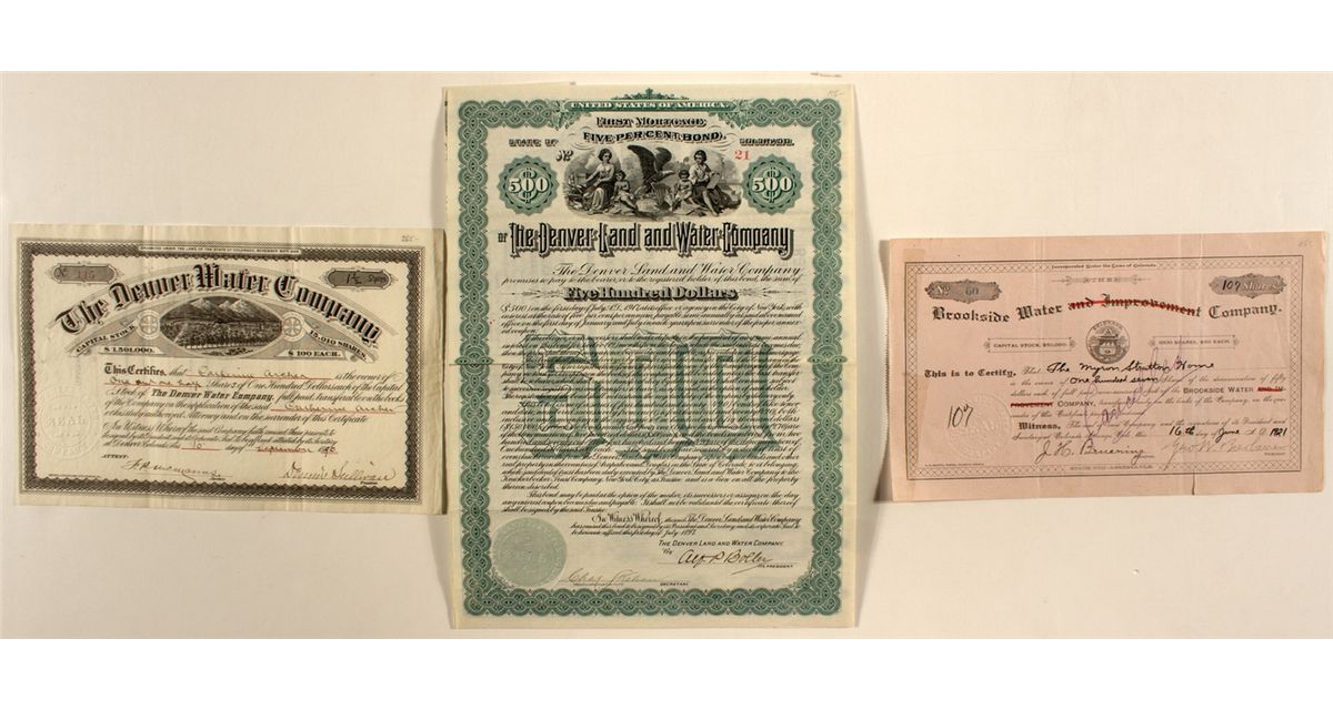 Three Colorado Water Stock Certificates. The Denver Water Company. Organized under the laws of the State of Colorado. Issued to Catherine Archer. Signed by Dennis Sullivan, President (and unreadable secretary) Uncancelled.