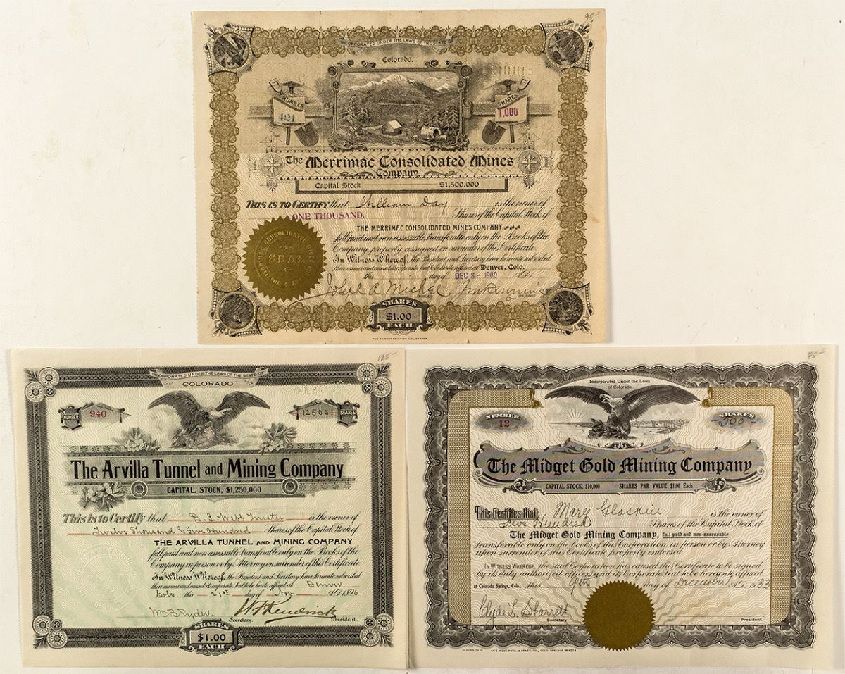 1) The Arvilla Tunnel and Mining Company. Issued 1896 for 12,500 shares. Not cancelled. Eagle vignette. 2) The Merrimac Consolidated Mines Company. Issued 1900. Not cancelled. Gilt border and multiple mining vignettes. Deep folds with some separation. 3) The Midget Gold Mining Company. Issued 1933. Not cancelled. Eagle vignette. (Prag Collection) City: Cripple Creek State: Colorado Date: 1896-1933 hwac# 34423