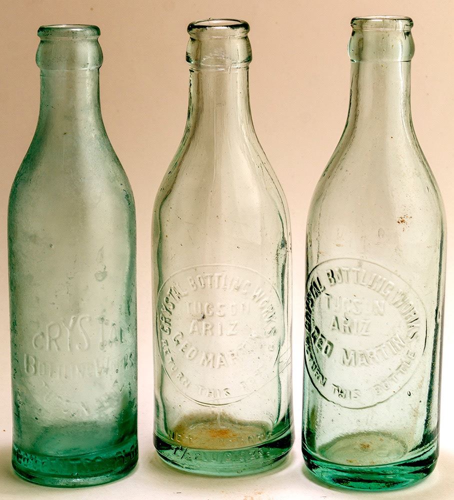 Three crown top Crystal soda bottles: 1) Crystal bottling works / Tucson / Ariz. / Geo. Martin / Return This Bottle. 2) Crystal bottling works / Tucson / Ariz. / Geo. Martin / Return This Bottle / Net contents / 7 1/2 Fluid Ozs. 3) Older Crystal / Bottling Works / Tucson, Ariz. / Contents 6 1/2 Fl Oz. HWAC# 45658 Date: c.1919-22 Location: Tucson, Arizona