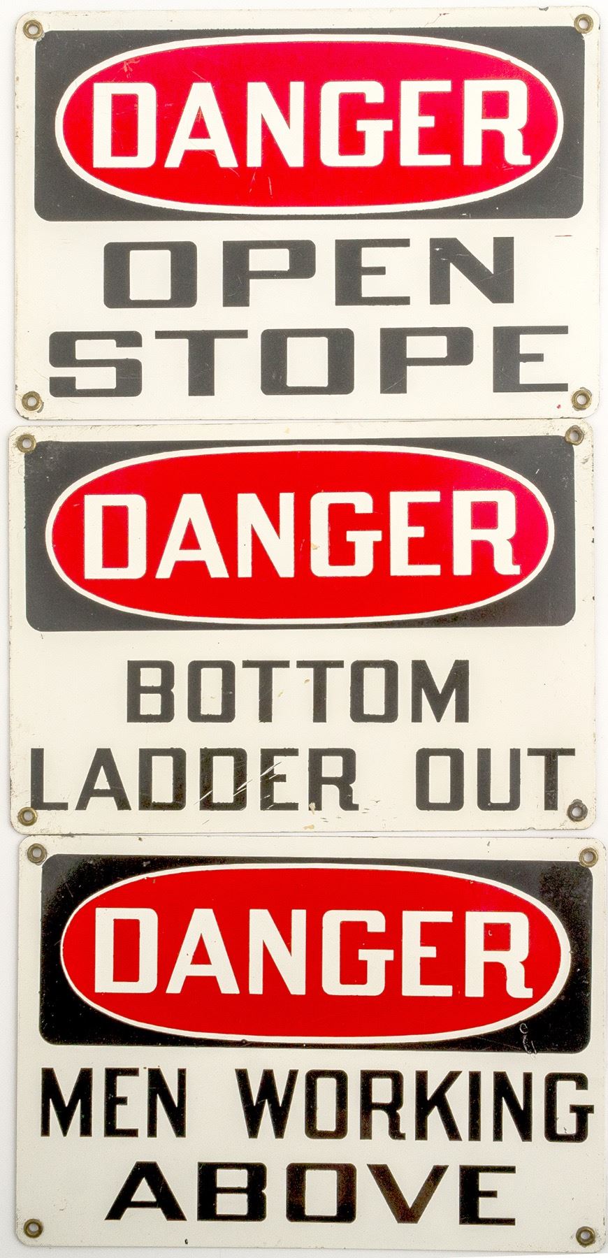 Lot of three, black lettering on white enamel, each 10 x 7 inches. Two are attributed to the Homestake Mine. 1) DANGER / Men Working / Above; 2) DANGER / Bottom / Ladder Out; 3) DANGER / Open / Stope. State: City: HWAC#: 47440 Date: