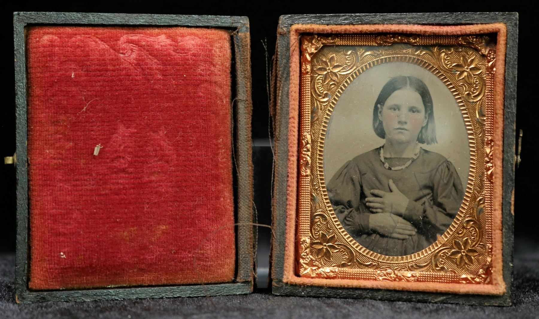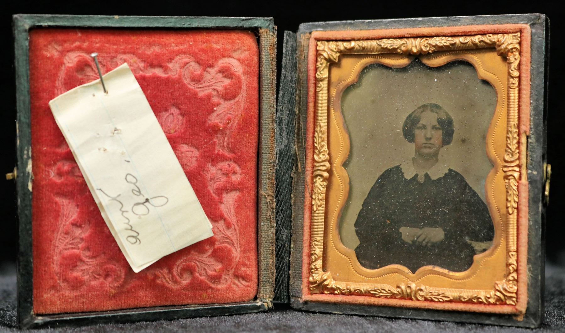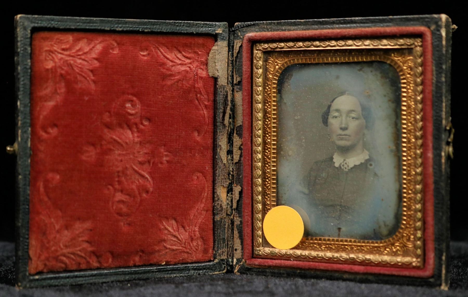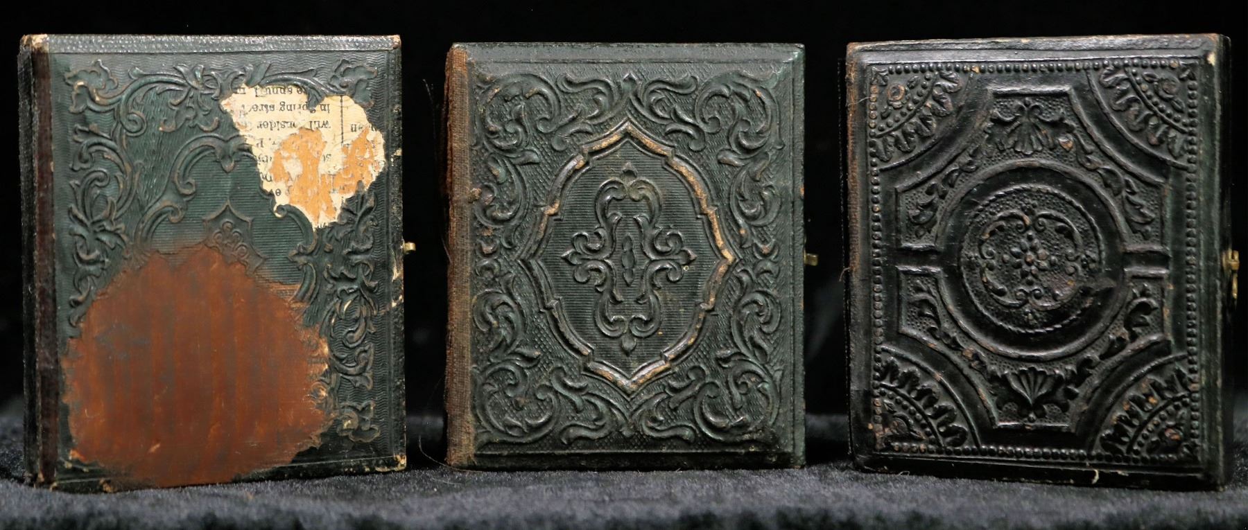 Three 1/9 plate daguerreotypes of three women in cases. The cases are in not great shape as the back binding has torn on two of the three, but they're still collectible. Please see photos for more details.