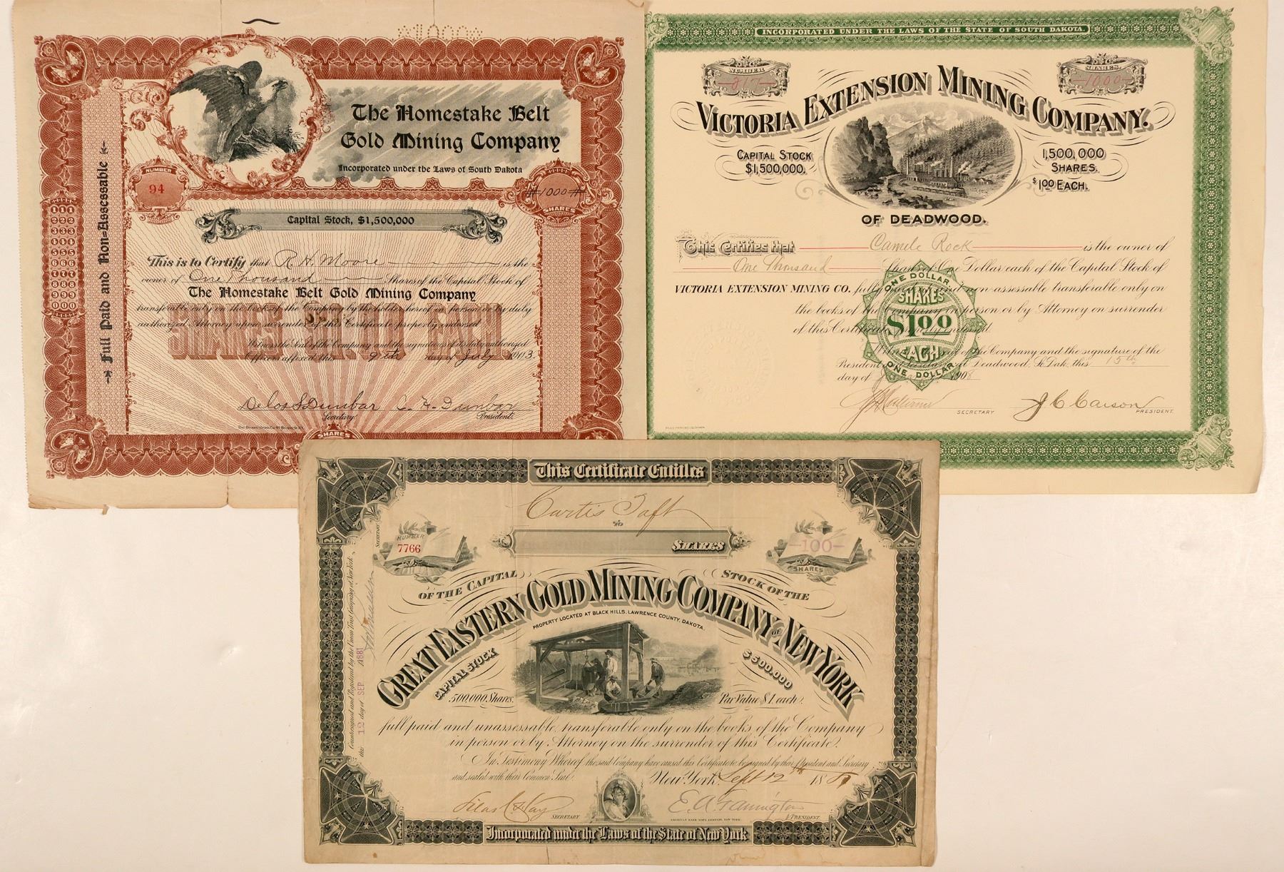 1) Great Eastern Gold. Property located at Black Hills, Lawrence County, South Dakota. # 7766 for 100 shares to Curtis Taft. Signed by president Farmington(?). Very nice vignette of ore bucket being raised by a winze. Dateline 1881. Incorporated 1879. Border issues: discoloration, dog ears, rips. 2) Homestake Belt Gold Mining Company. # 94 for 1000 shares to RH Moore. Signed by Delos S Dunbar and president CH Dunbar. Advertisement in local paper promotes it as the southern extension of the belt of ore of the famous Homestake mine. Eagle vignette. Reddish brown safety paper with underprint of 'Shares $1.00 each.' 3) Victoria Extension Mining Company of Deadwood. # 217 for 1000 shares to Camele Rock. Dateline 1908. Incorporated 1905.Signed by president JC Carson. Valley mining vignette. Underprint of 'one dollar / Shares $1.00 each / one dollar.' Green and black on white. Nice condition. Organized to take 1,000 acres of the Ragged Top District. Includes the mines: Favorite, May Queen, Ulster, Little Bud and the townsite of Preston. Ken Prag Collection