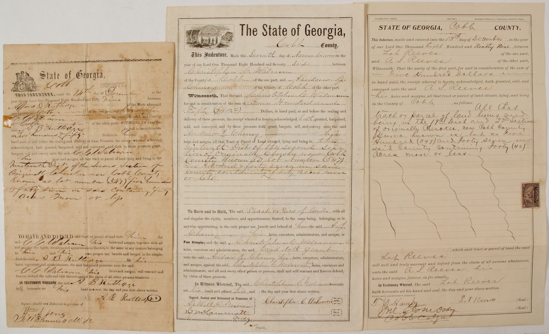 This file of deeds well illustrates the title problems of the South. Record keeping was problematic, and a systematic approach was not universal from county to county, and each county recorder started the records in their own way. As a place on the developing frontier, it is easy to see how and why the records were not regularly kept. The need for specific title was not as exact and necessary as it is today. The various county court houses needed to develop their own methods by trial and error. In deed and property research, not all deeds are or were recorded. The necessity of this is a desire and requirement of modern thought. Thus this file, for property in Cobb County, includes a deed executed (fully signed by both parties) in 1876 but not filed with the county until 1947, as reflected on the face of the document. It was not unusual for original deeds such as this to stay with the property owners, turned over to the next owner only after a sale. In this case, the parcel may have been held for a lengthy time in the same family, resulting in formal document transfer nearly a century later. Rarely did these documents last, subject to weather, fires, mold, mice and other critters. This file contains three deeds for the same property. These deeds are for lot 547 in the 19th District, Second Section in Cobb County. They are dated 1857, 1875 and 1899. They may be the only formal record extant of this portion of the parcel’s title. Family names are Reeves, Rutledge, and Walraven. State: Georgia City: Cobb County Date: 1857, 1875, 1899 Al Adams Collection. HWAC# 57046