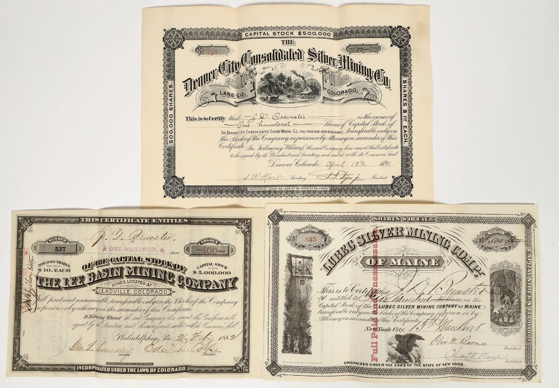 Lot of 3 different. Includes: Lubec Silver Mining Company of Maine 1878; Denver City Cons. Silver MC (Lake County, CO), 1891; and Lee Basin MC, Leadville, 1882. Please inspect.