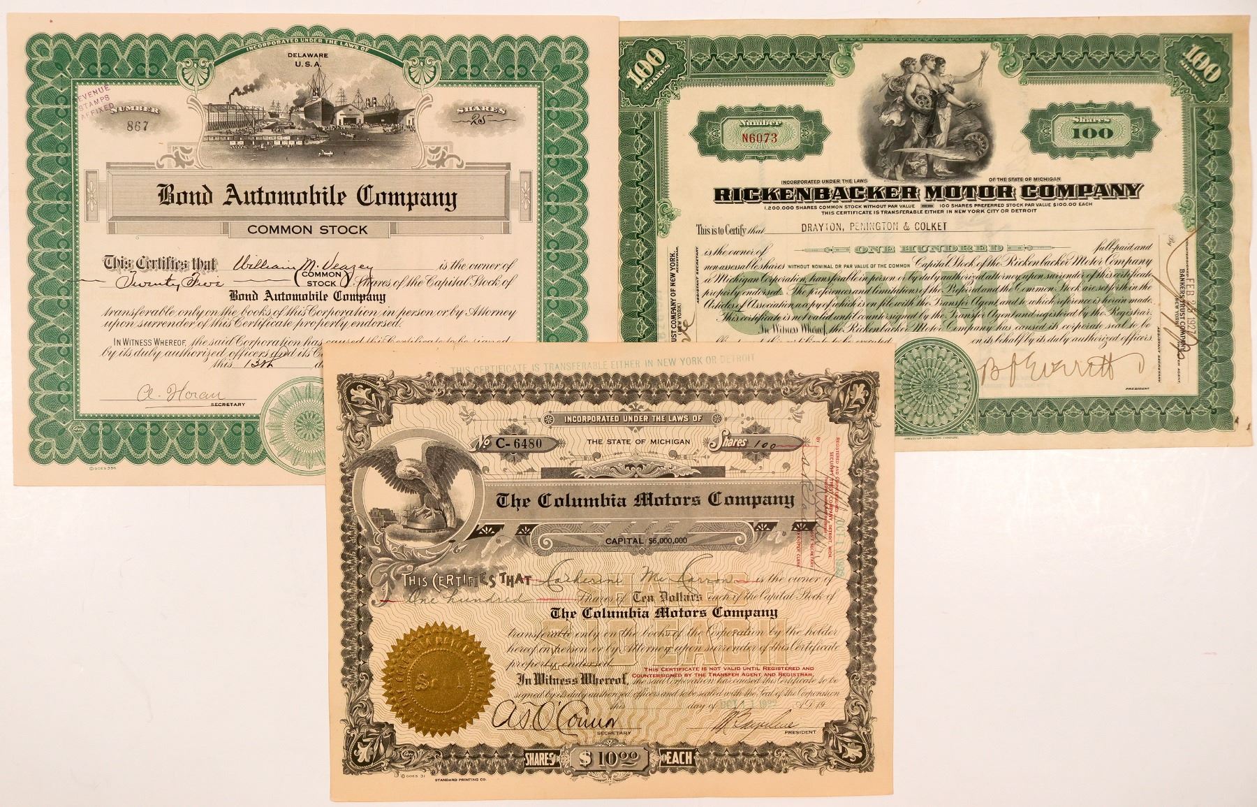 Lot of 3 different. 1) The Columbia Motors Company. Inc. in Michigan. Issued in 1922, not cancelled. Eagle vignette. Folds, toning. Operated 1916-1924 in Detroit. 2) Bond Automobile Company. Inc. in Delaware. Issued in 1925, not cancelled. Vignette of ship yard. Heavy folds. St. Louis, Missouri. 3) Rickenbacker Motor Company. Inc. in Michigan. Issued in 1927, not cancelled. Allegorical vignette. Pinholes, folds, toning. Operated 1922-27 in Detroit. Ken Prag Collection