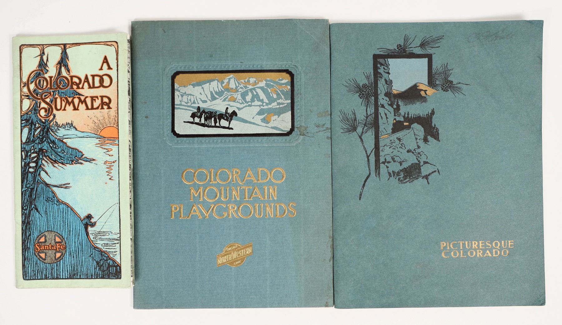 Lot of 3 different. 1) "Picturesque Colorado", Compliments of the Colorado & Southern Railway, 1900, TE Fisher. Smith-Brooks Printing, Denver. Approx. 15 pages with text and photos. 10 x 7.25" 2) "A Colorado Summer." 1915 Santa Fe Colorado guide. Not paginated. Text and scenic black & white photos plus a map. 8.75 x 4" 3) "Colorado Mountain Playgrounds." Chicago Northwestern Line. 1931. 48pp. Great listing of all the hotels and resorts in Colorado. 10 x 7"