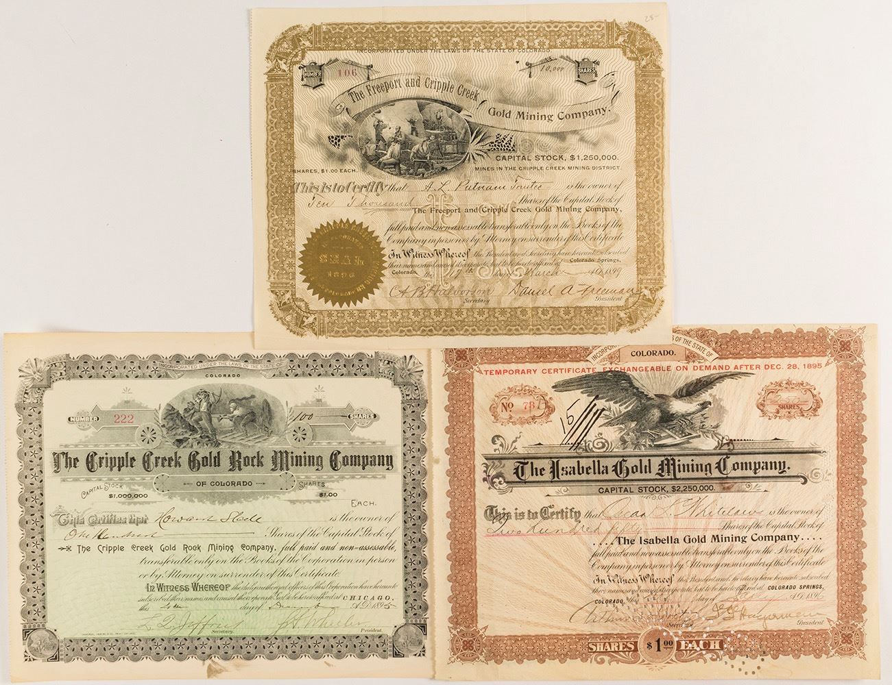 Isabella Gold Mining Co I/C 1896 to Oscar Whitelaw #78 250 shares, signed by president Hagerman. Cripple Creek Gold Rock Mining Co. I/U 1895 to Howard Slade #222 100 shares signed by president Wheeler, Freeport and Cripple Creek Gold Mining Co I/U to AL Putnam 1899 #106 10000 shares signed by president Freeman. All approx 7.75" x 9.5". Date: Location: Cripple Creek , Colorado HWAC # 54344