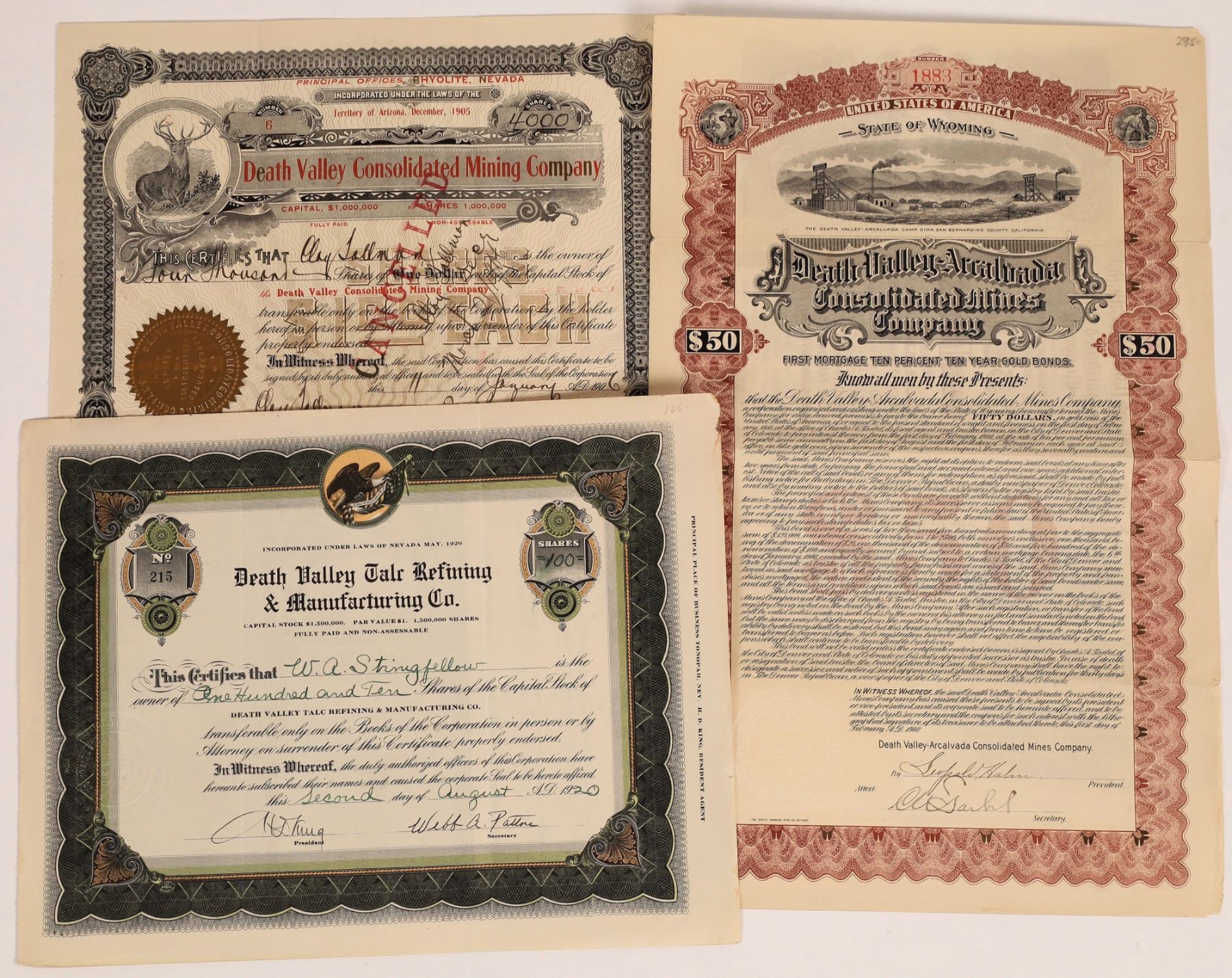 Lot of 3 different. 1) Death Valley Consolidated Mining Company. Low cert. #6, issued to Clay Tallman for 4000 shares in 1906. Signed by W.H. Seaman as president and Tallman as secretary. Stamp and pen cancelled. Principal offices: Rhyolite, Nevada. Inc. in Arizona in 1905. Seaman formed the company during the Bullfrog excitement to work the big, low grade lead deposit called the March Storm at the head of Titus Canyon (Lingenfelter). After about six months, Seaman gave the property up as worthless. Nearly 20 years later, C.C. Julian bought the claims and formed the Western Lead Mines Company. 2) Death Valley-Arcalvada Consolidated Mines Company. $50 bond issued in 1908. Signed by president Leopold Halin and the secretary. Not cancelled. Red border and black print, vignette of The Death Valley-Arcalvada Camp at Cima, San Bernardino County. Toning, folds, with some separation. 3) Death Valley Talc Refining & Manufacturing Company. Issued for 100 shares in 1920. Not cancelled. Green, gold and black border. Eagle vignette. Folds, wear to edges.