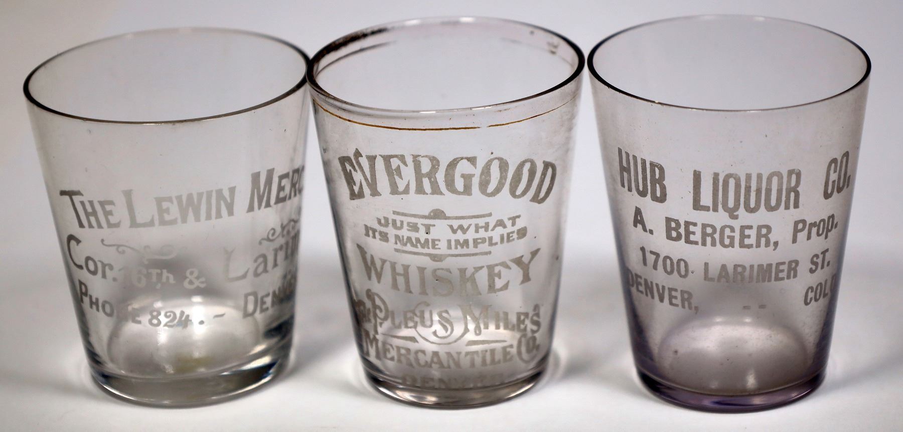 Lot of 3 different. 1) Hub Liquor Co., A. Berger. 2 3/8"H x 1 7/8"W. Tiny nick on rim, otherwise very nice. 2) Evergood Whiskey, The Pleus Miles Mercantile Co. 2 3/8"H x 1 7/8"W. Some loss to gold rim, small wear marks. 3) The Lewin Merc. Co. 2.25"H x 2"W. Sticker residue on bottom, otherwise very nice.