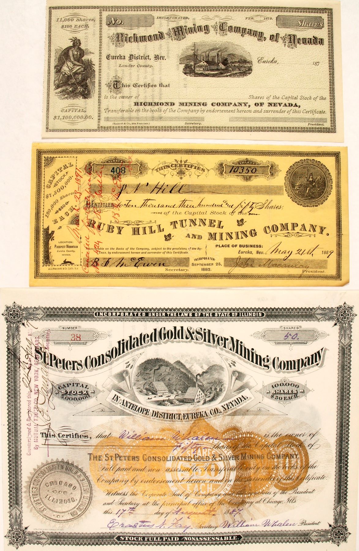 1) Ruby Hill Tunnel & Mining Company. Eureka, Nevada. Issued May 21st, 1889 for 10,350 shares.Pen cancelled. Location: Prospect Mountain. Pinhole, folds, very fine. 2) St. Peters Consolidated Gold & Silver Mining Co. Location listed below logo: Antelope District, Eureka County, Nevada. No. 38, issued for 50 shares to president William Whalen on August 17th, 1887. Also signed by the secretary. Not cancelled. Gilt underprint and vignette of mining camp. Bent corner. Very fine. 3) Richmond Mining Company of Nevada. Location printed as Eureka District, Nev. Unissued. c.1870s. Mine and Native American vignette. State: Nevada City: Eureka County Al Adams Collection. HWAC# 58477