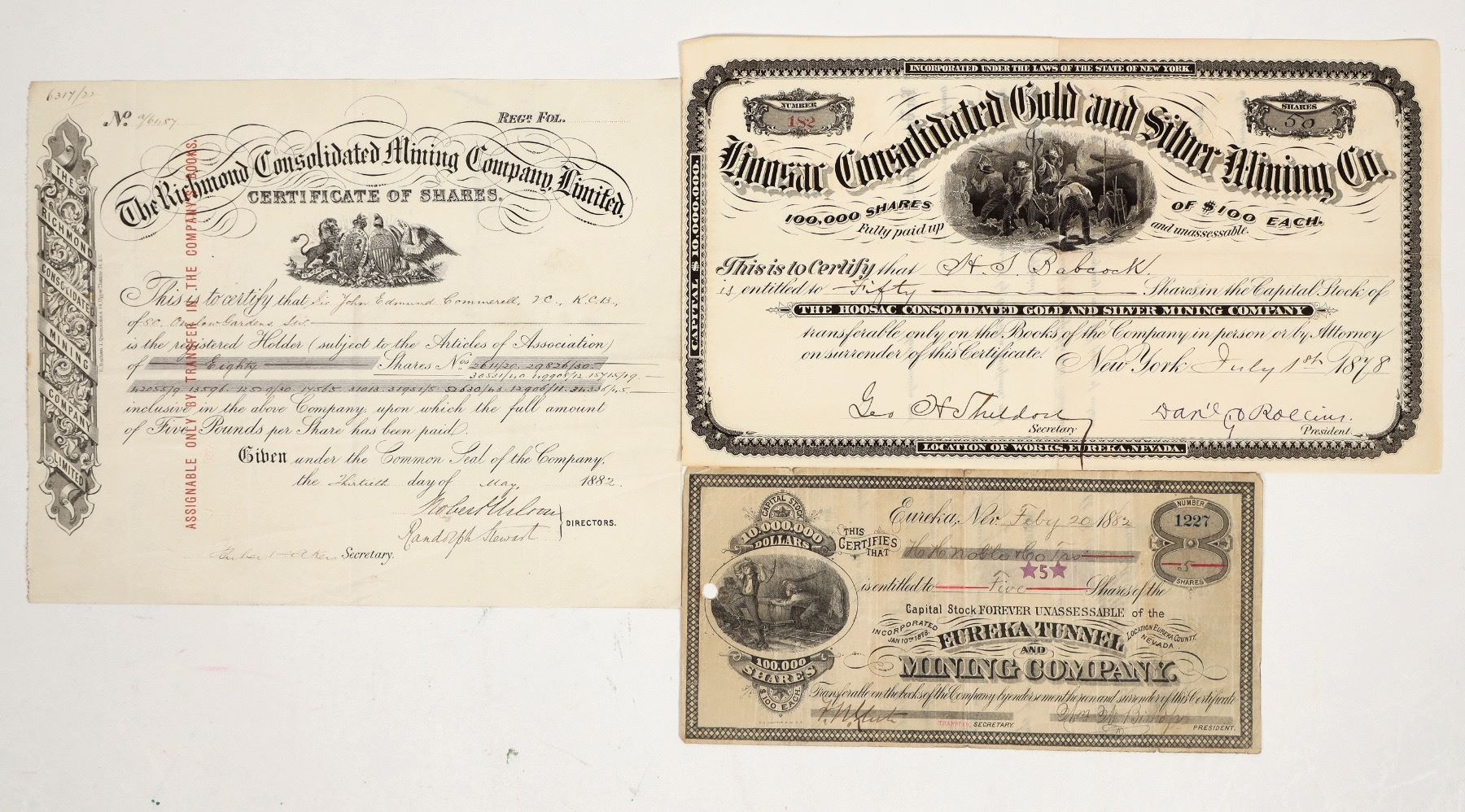 Lot of 3 different. 1) The Richmond Consolidated Mining Company, Limited. Rare. Issued in 1882, not cancelled. Incorporated in 1871, this was one of the largest mining companies at Eureka, producing lead and silver. The Richmond erected a refinery in 1874 and began desilverization of its bullion. It's smelting plant gradually became the best of its kind in the West. Its English ownership lasted into the 1880's when the mine was sold. 2) Eureka Tunnel & Mining Company. Issued in Eureka in 1882. Hole punched. Folds, toning. 3) Hoosac Cons. Gold & Silver Mining Company. Issued in 1878 in NY, not cancelled. Mining vignette. Folds, toning on reverse. Hoosac Mine was one of oldest in district located in 1869. Mine workings were in quartzite.