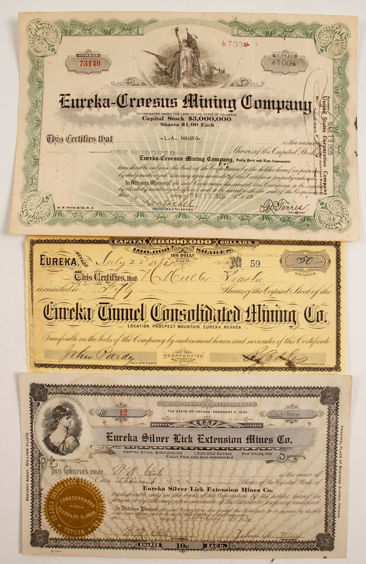 2. Eureka Silver lIck Extension Mines Co, incorporated Feb 6, 1920 State of Nevada. Cert #12 for 1000 shares of common stock @ 10 cents per share issued to W.M. Clute (also resident agent) Feb 20, 1920 signed