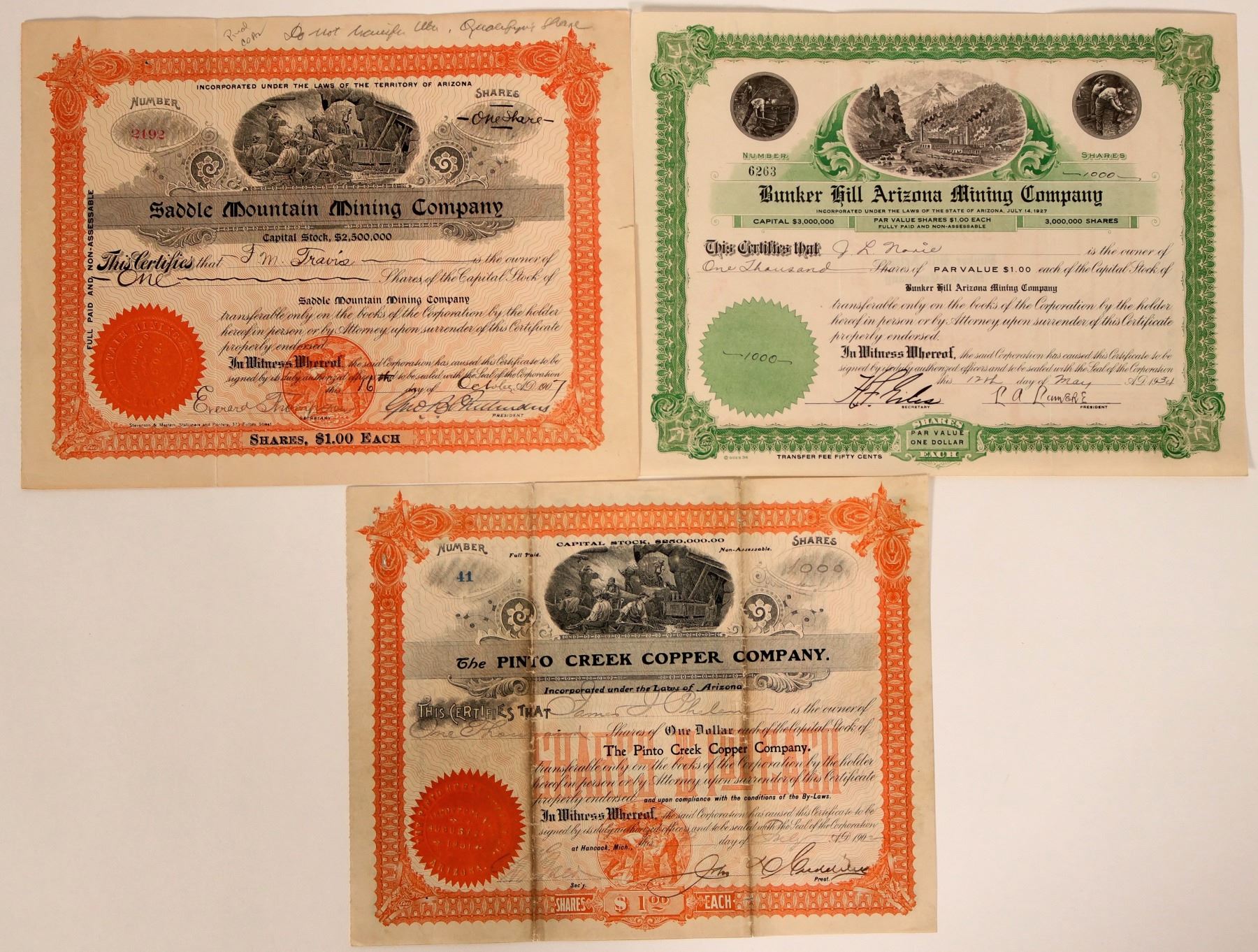Lot of 3 different. 1) Saddle Mountain Mining Company. Saddle Mountain Mining District. Issued in 1907, not cancelled. Orange border and seal, black print, and mining vignette. Folds, staple holes, and toning. 2) Bunker Hill Arizona Mining Company. Issued in 1934, not cancelled. Green border, black print, and 3 mining vignettes. Pinholes, folds. 3) Pinto Creek Copper Company. Issued in 1902, not cancelled. Orange border and seal, black print, and mining vignette. Heavy folds, tape repairs, heavy soiling.