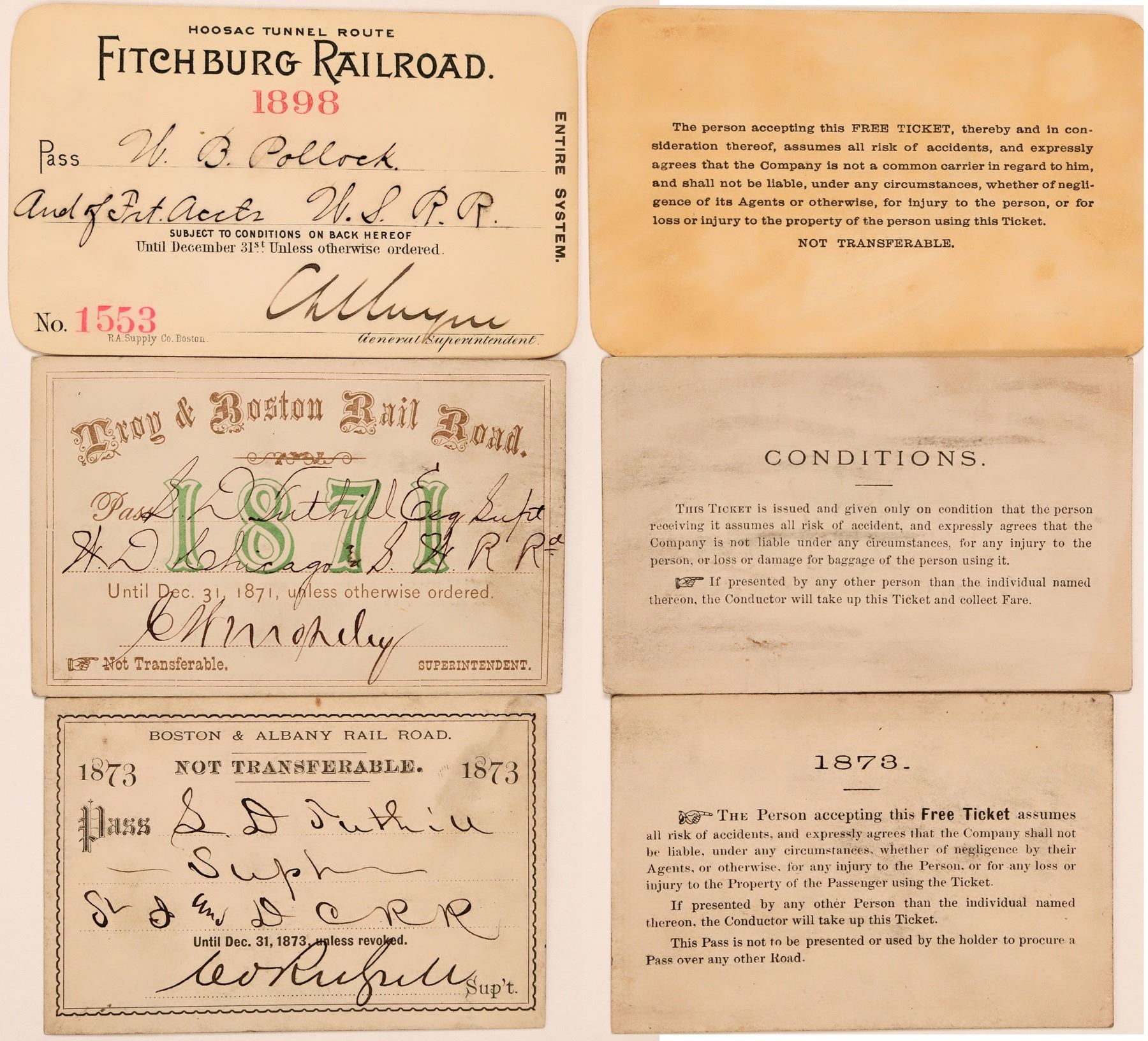 Lot of 3 different. All signed by the superintendent. 1) Troy & Boston Rail Road. Issued in 1871. Some soiling. 2) Boston & Albany Rail Road. Issued in 1873. Soiling. 3) Fitchburg Railroad, Hoosac Tunnel Route. Issued in 1898. Toning, wear on reverse.
